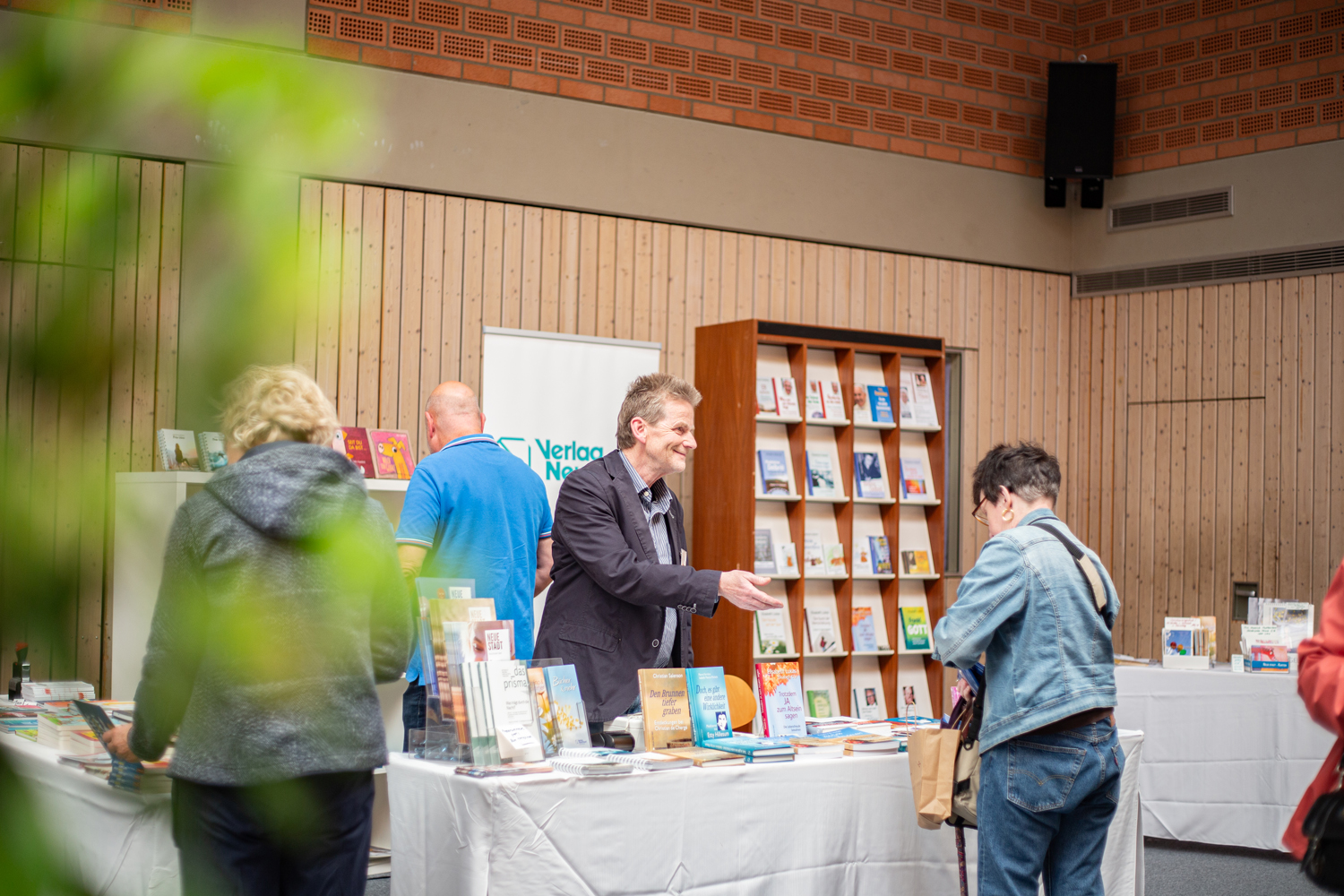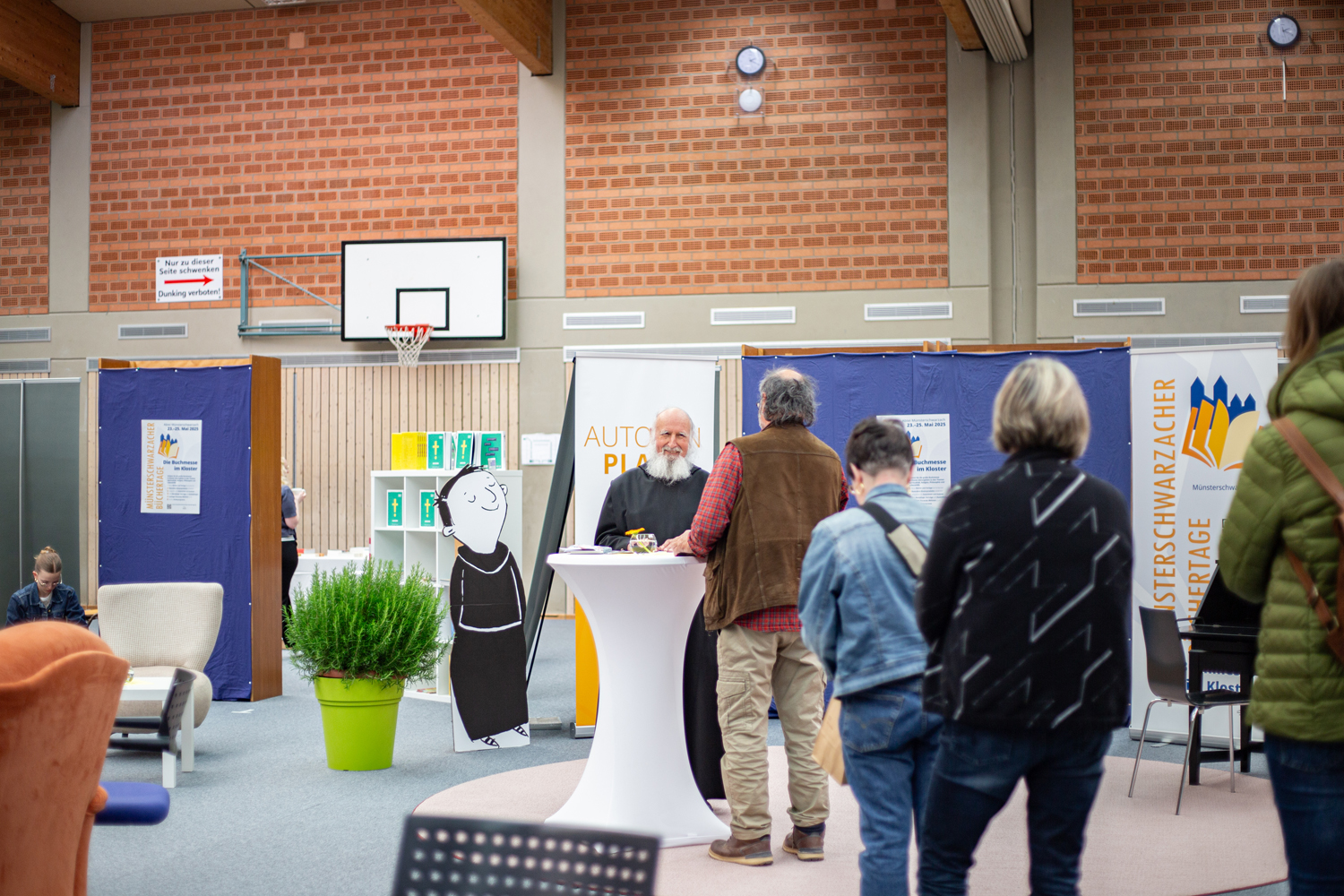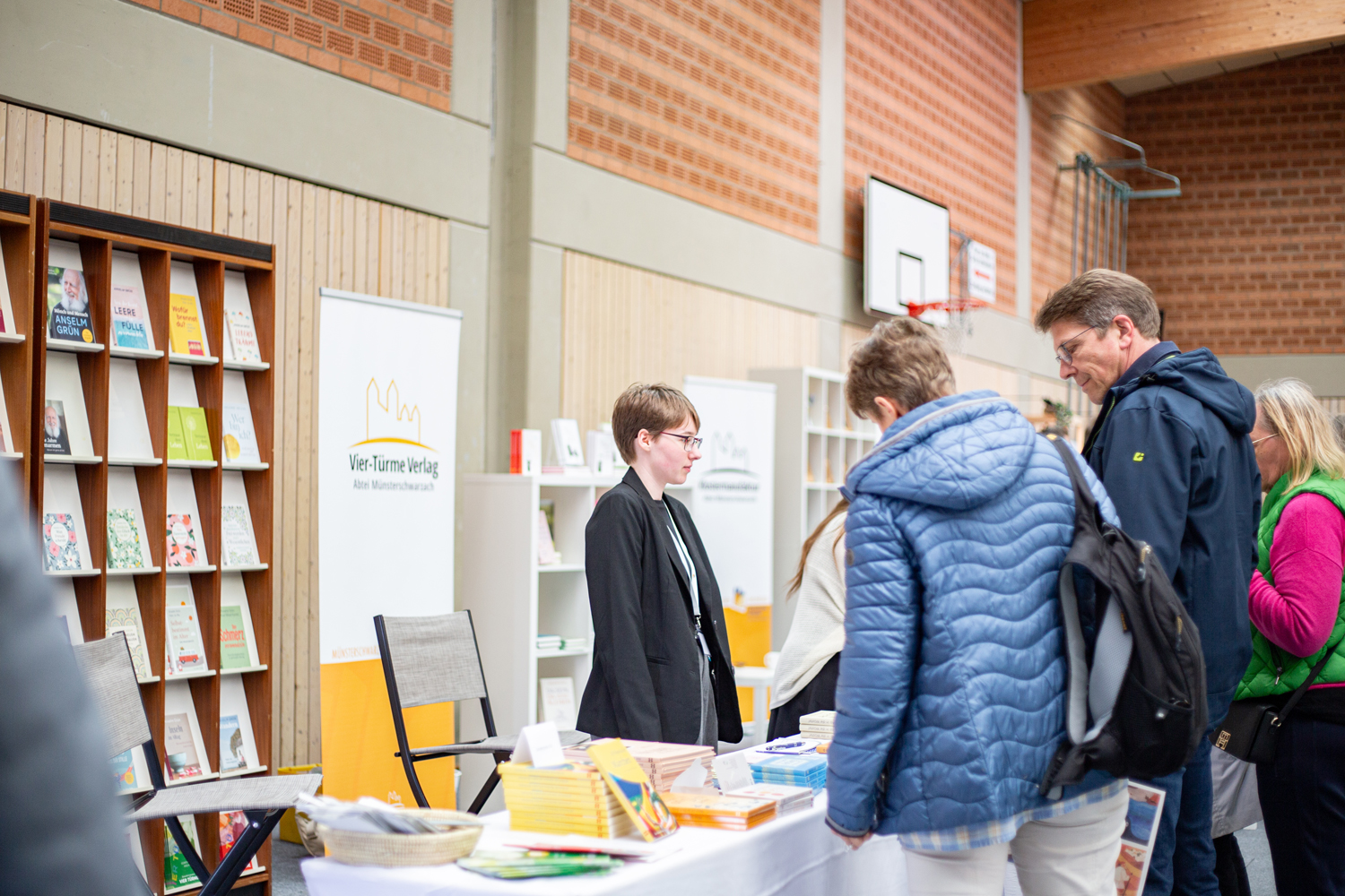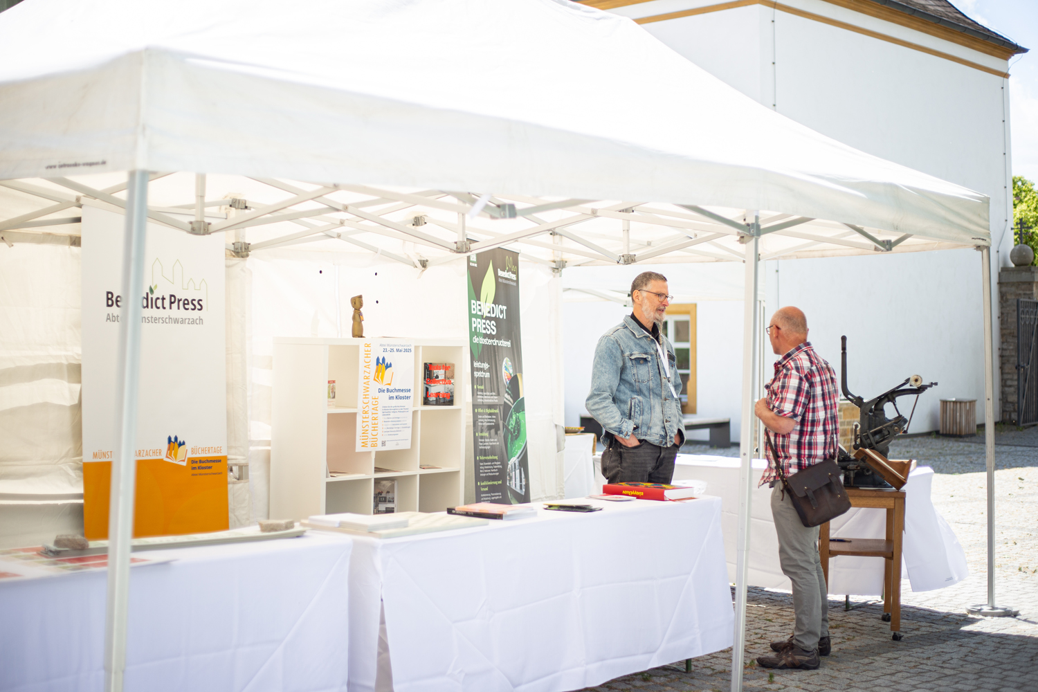 Mit vielen Besucherinnen und Besuchern haben die zweiten Münsterschwarzacher Büchertage begonnen. Schon auf dem Kirchplatz luden die ersten Stände von Trusted Craft Design, der Druckerei Benedict Press, dem Fair-Handel und der Klostergärtnerei zum Stöbern, Entdecken und Verweilen ein. Am Stand der Druckerei konnte mit einer traditionellen Buchpresse ein tolles Mitbringsel gemacht werden, die Gärtnerei verkaufte eigens gezogene Bio-Jungpflanzen. In der großen Messehallte erwartete die Gäste eine Vielfalt an Verlagen mit ihrem aktuellen Programm: von Kinderbüchern bei Don Bosco, die deutsche Akademie für Kinder- und Jugendliteratur über die Bandbreite an renommierten christlich-spirituellen Verlagen wie echter, Herder, Chrismon, Claudius, eos, Verlag Neue Stadt. Tyrolia, Friedrich Pustet, dem Pilger-Verlag, Michaelsbund und natürlich dem klostereigenen Vier-Türme-Verlag bis zu orthodoxen Verlagen und Medien.