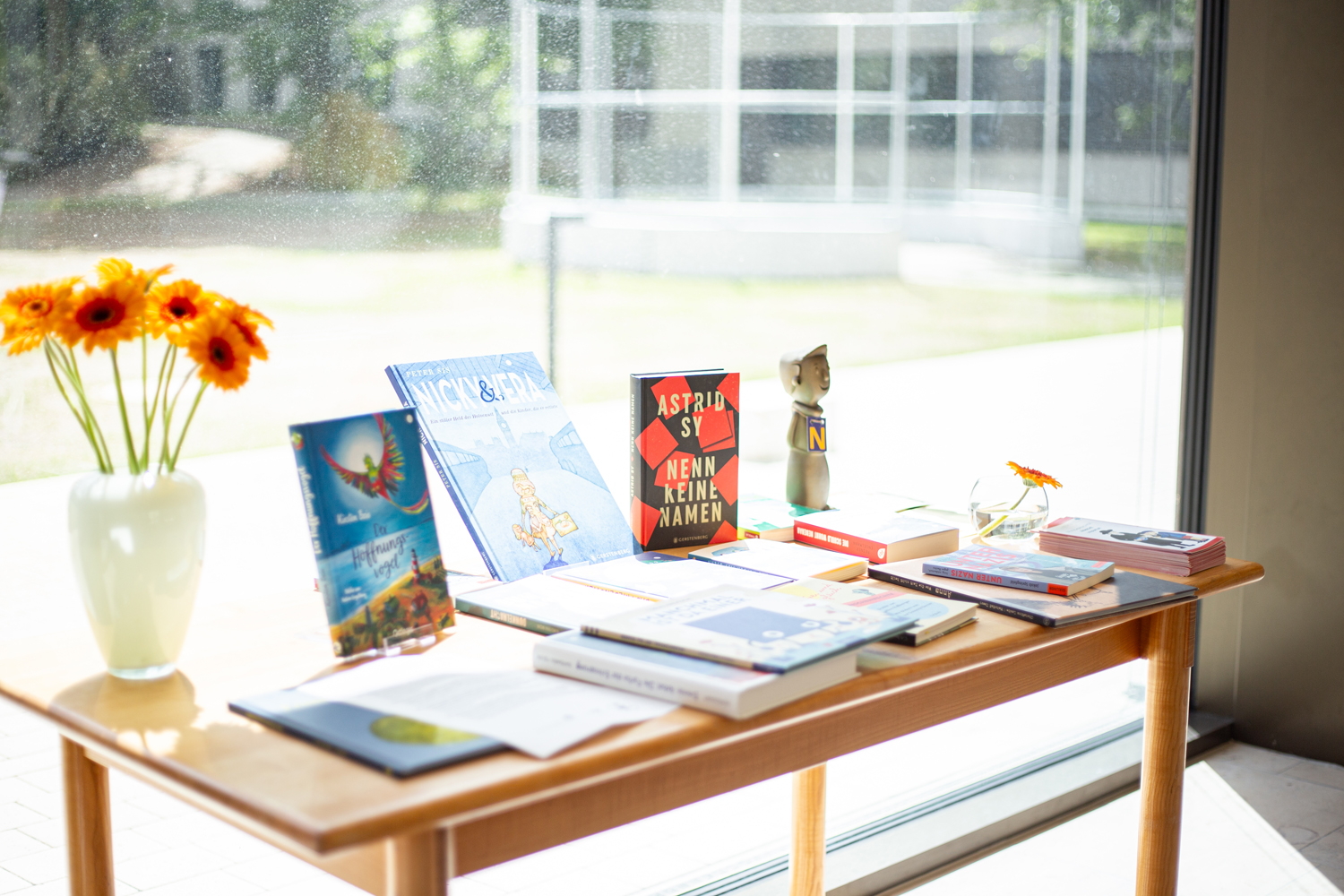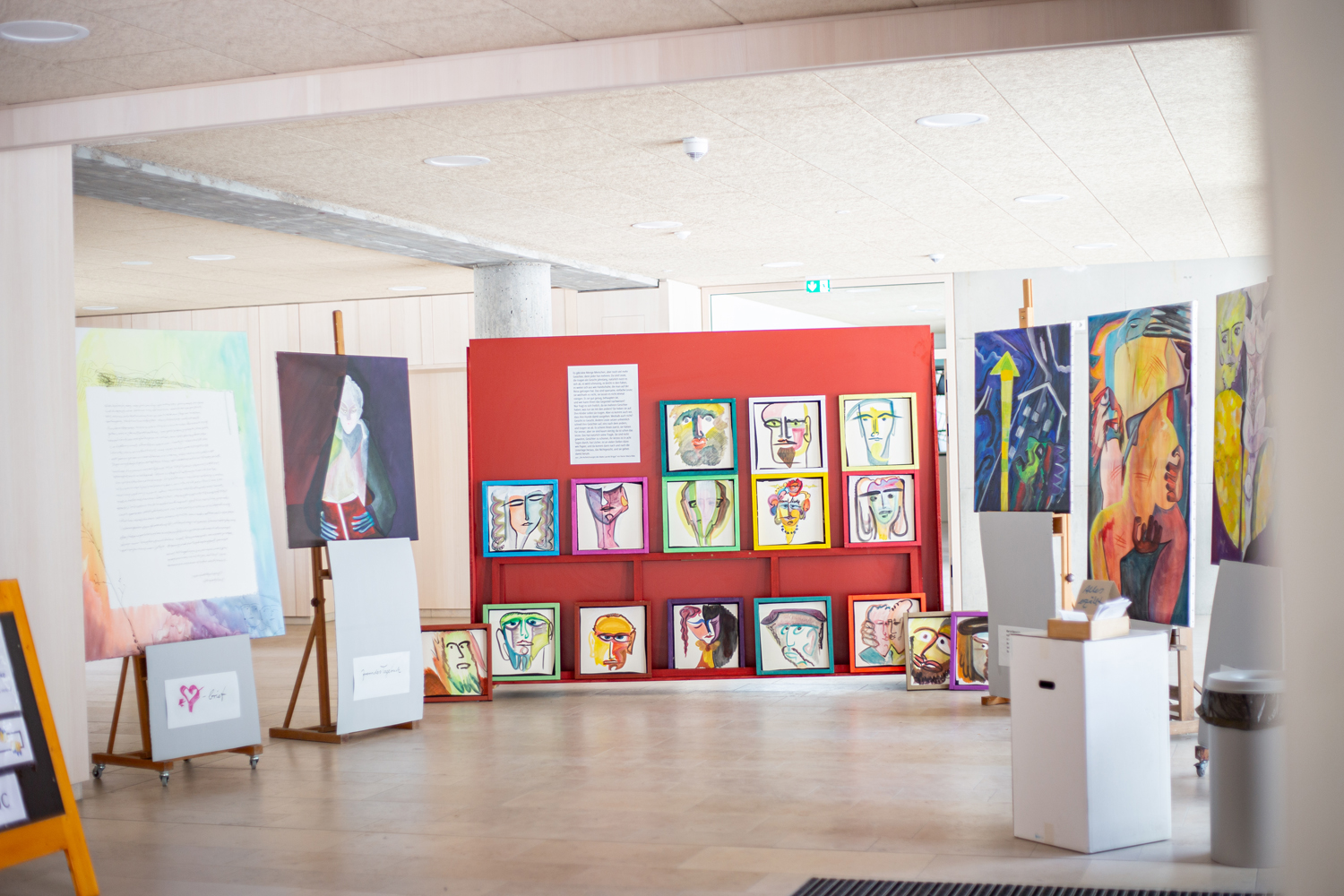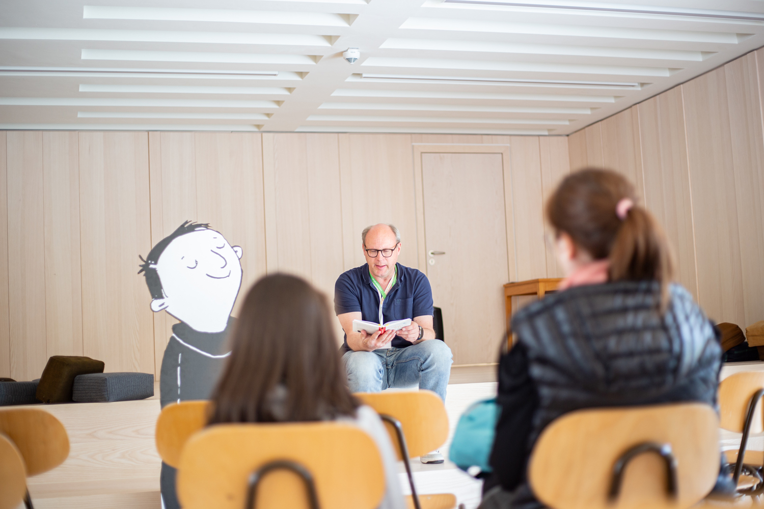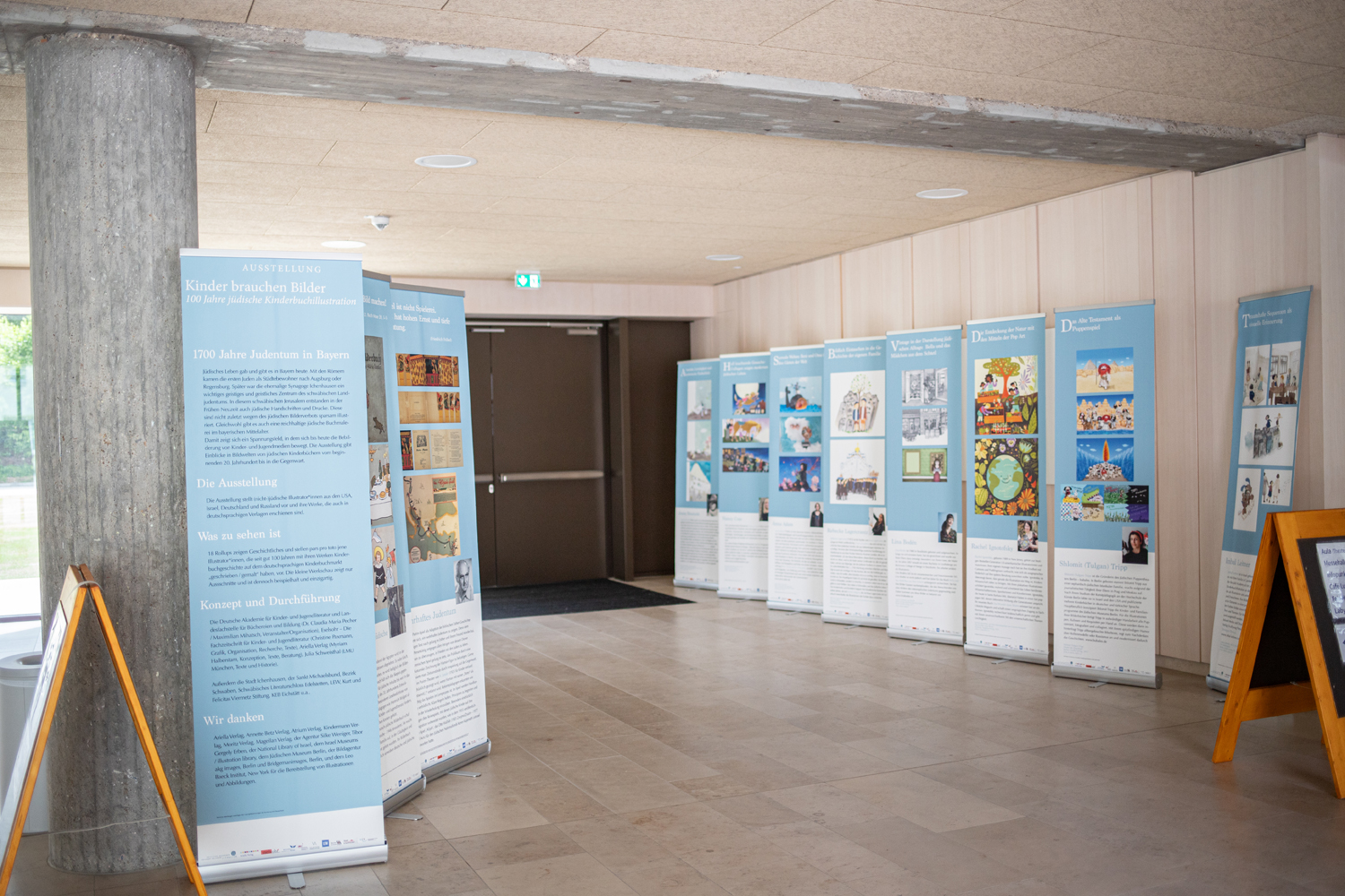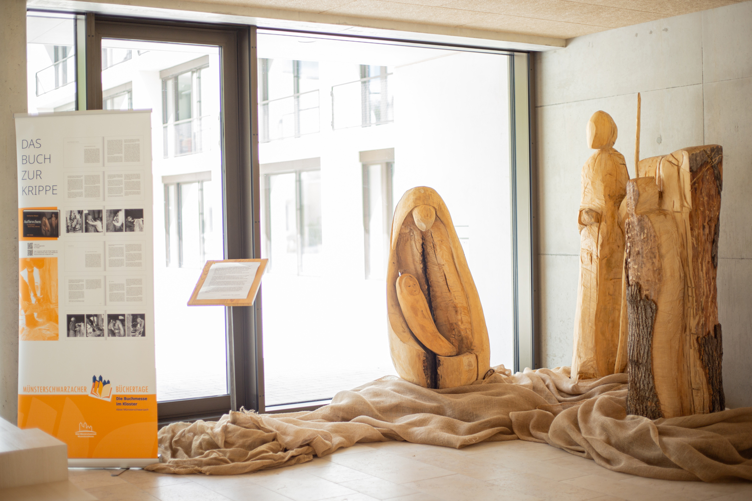Begleitende Ausstellungen von P. Meinrad Dufner, die Krippe von P. Zacharias Heyes sowie eine Ausstellung zu 100 Jahre jüdische Kinderbuchillustration flankieren den Weg von der Messehalle zu den Autorenlesungen in der Aula des Egbert-Gymnasiums.