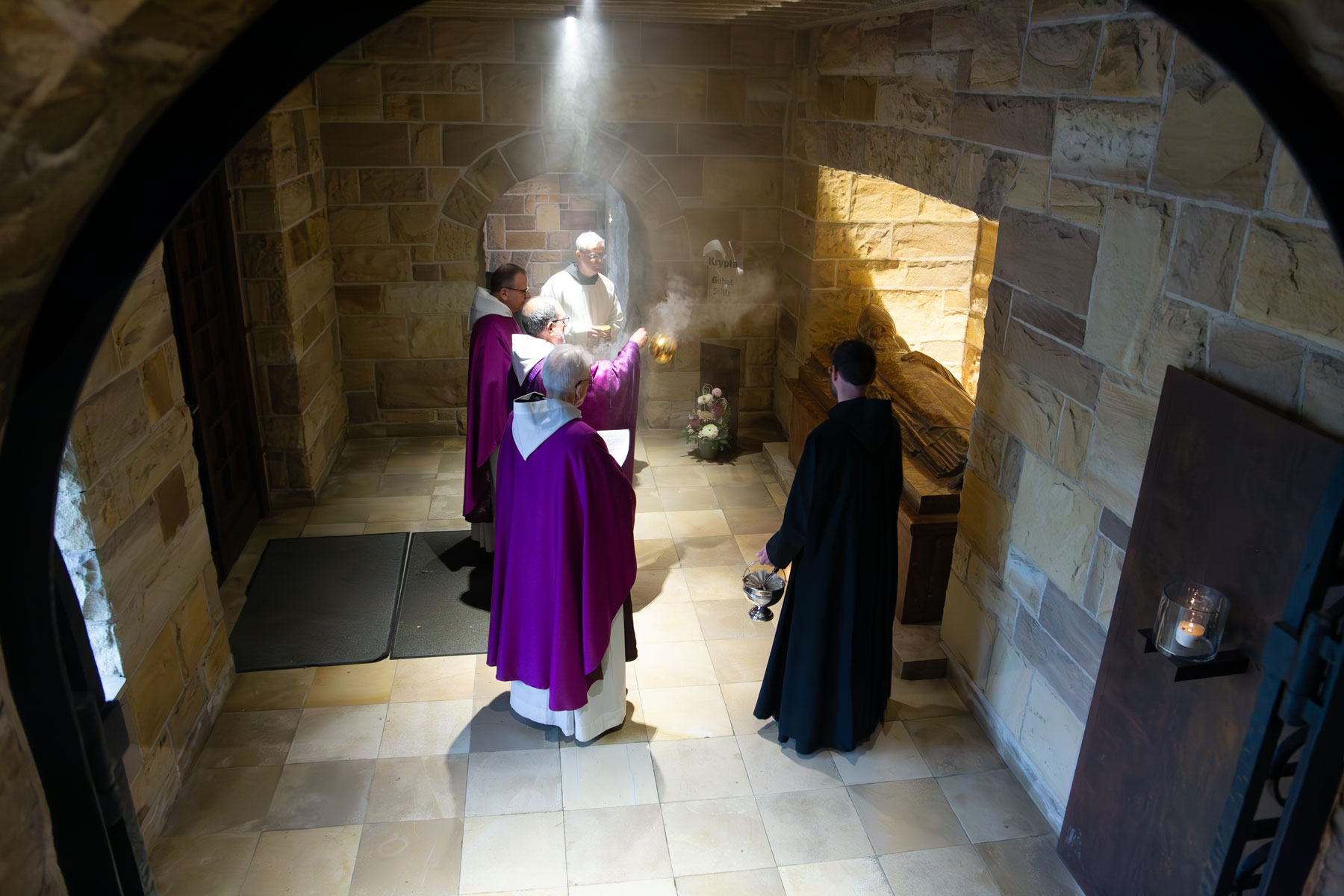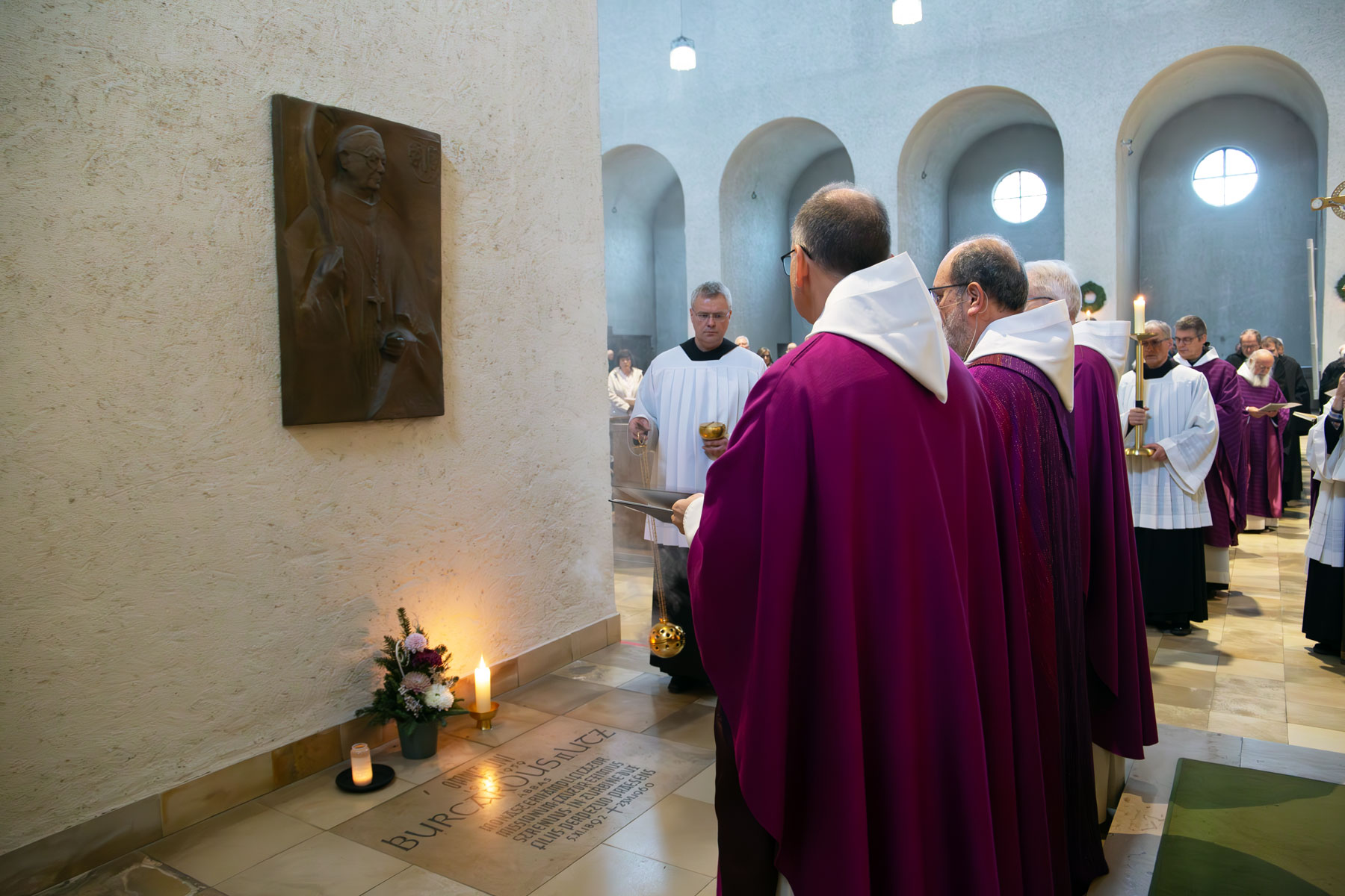 Das Besondere am Gottesdienst an Allerseelen ist der Besuch der Gräber in der Abteikirche. Dort befinden sich die letzte Ruhestätte der Äbte Placidus, Burkhard und Bonifaz sowie des Altbischofs Joachim. Zudem sind auch sterbliche Überreste von Mönchen aus früheren Zeiten dort beigesetzt. Abt Michael Reepen sprach an den Gräbern ein Gebet und segnete diese mit Weihrauch und Weihwasser.