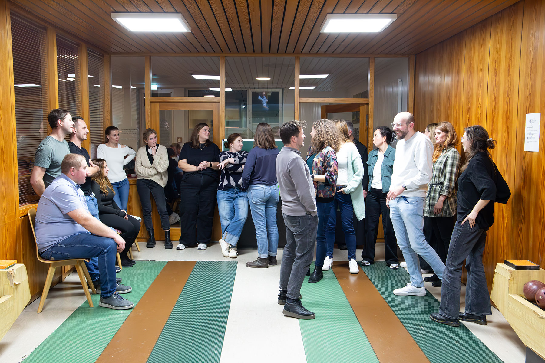 Dieses Mal steht ein Abend auf der Kegelbahn auf dem Programm. Nach einer wärmenden Suppe geht es in die Vorstellungsrunde. Schnell zeigt sich, dass die Gruppe bunt gemischt ist. Egbert-Gymnasium, Klosterküche, Fair-Handel oder Elektrowerkstatt – es sind viele Betriebe vertreten. Im Anschluss wartet eine süße Überraschung. Von der Klosterbäckerei gibt es Kekse in Form von Martinsgänsen. Es folgt der gemütliche Teil. Die meisten der knapp 30 Teilnehmer drängt sich auf die Kegelbahn. Ein harter Kern spielt Schafkopf. Gemeinsam lässt die Gruppe den Abend ausklingen – und freut sich schon auf die nächste Veranstaltung.