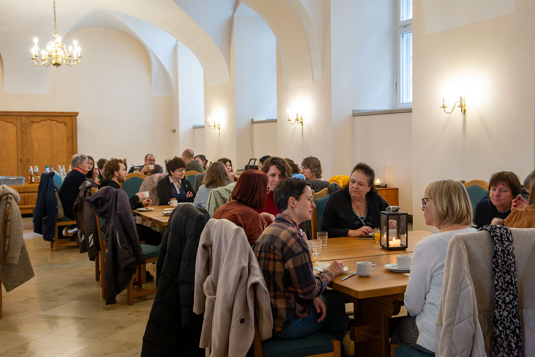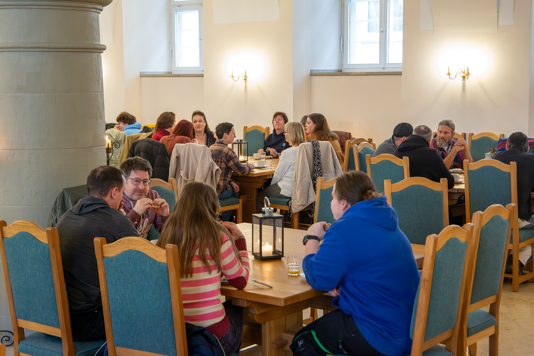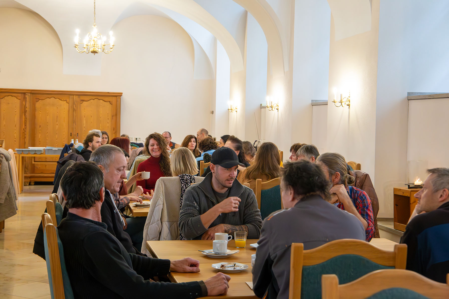 Auf den Tisch kommen Leckereien aus dem Kloster. Knusprige Brötchen und vier Sorten Christstollen aus der eigenen Bäckerei, Wurst- und Käsespezialitäten von der Klostermetzgerei. Beim gemütlichen Frühstück lässt sich ausführlich mit den direkten Kolleginnen und Kollegen plaudern. Zudem treffen an den Tischen oft verschiedene Betriebe aufeinander. Ein kurzer geistlicher Impuls von Br. Pascal Herold und ein gemeinsames Adventslied runden die Veranstaltung ab. Frisch gestärkt geht es im Anschluss zurück an die Arbeit.