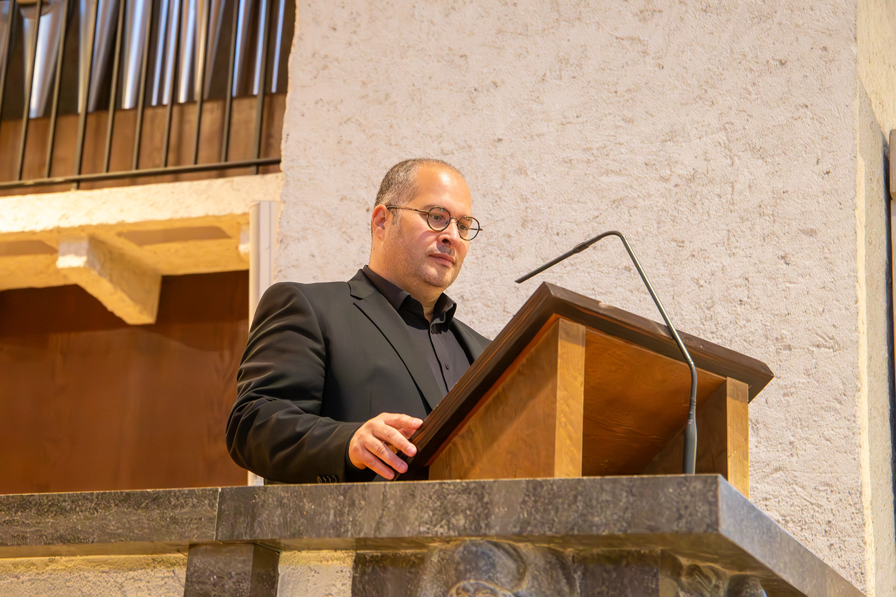 Besonders beeindruckte die musikalische Umsetzung. Stephan Emanuel Knauer nutzte dafür die ganze Bandbreite, die ihm die Orgel in der Abteikirche bot. Gekonnt griff er die von Manfred Bühler vorgetragenen Inhalte auf. Bei der musikalischen Übersetzung deckte er alle Tonalitäten ab – von melodisch sanft bis dissonant bedrohlich. Das Publikum wurde völlig in den Bann gezogen. Am Ende des Konzertes herrschte ergriffene Stille, bevor die Künstler mit überschwänglichem Applaus bedacht wurden.