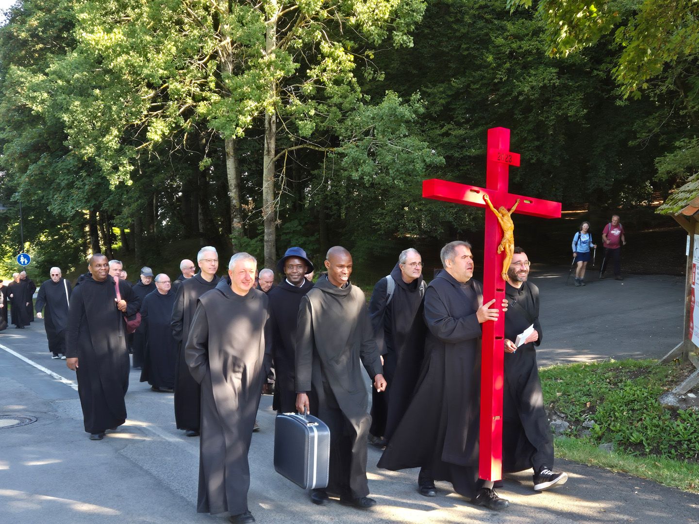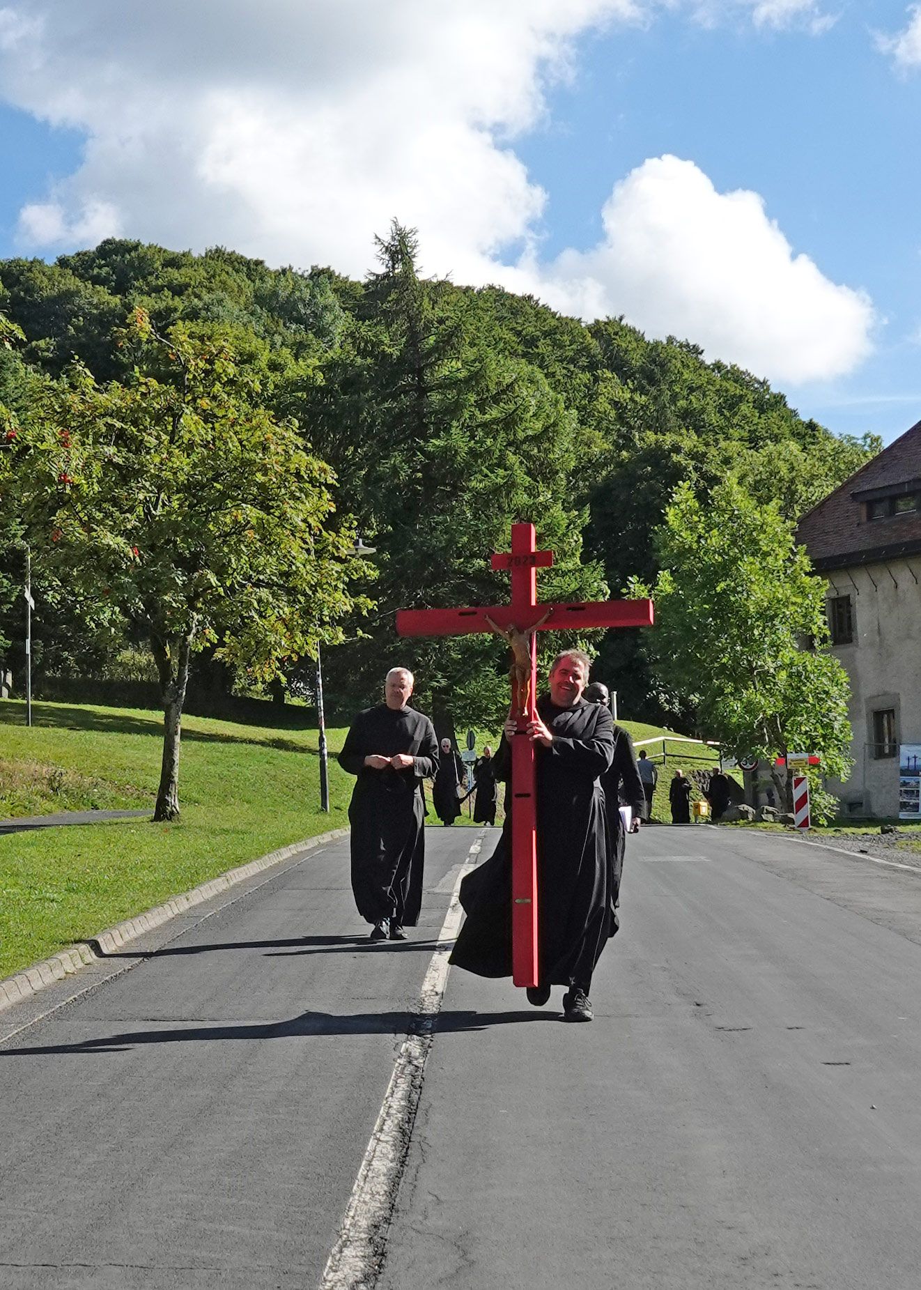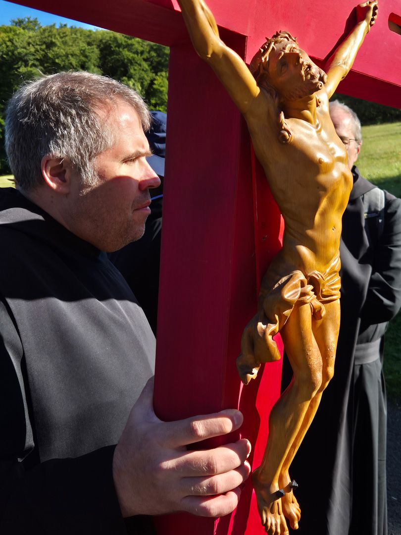 Beim gemeinsamen Gang zur Kirche zog uns ein Kreuz voraus, das uns schon seit mehreren Jahren begleitet. In seinen hohlen Balken befanden sich kleine Zettel mit Gebetsanliegen, die wir vorab zusammengetragen hatten. In diesen Anliegen feierten wir in der Wallfahrtskirche die Eucharistie. Abt Michael Reepen übernahm die Predigt zu diesem besonderen Anlass.