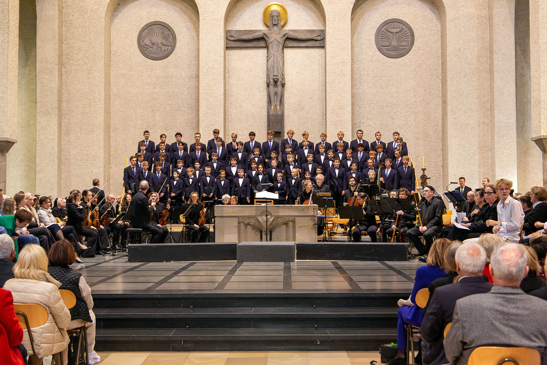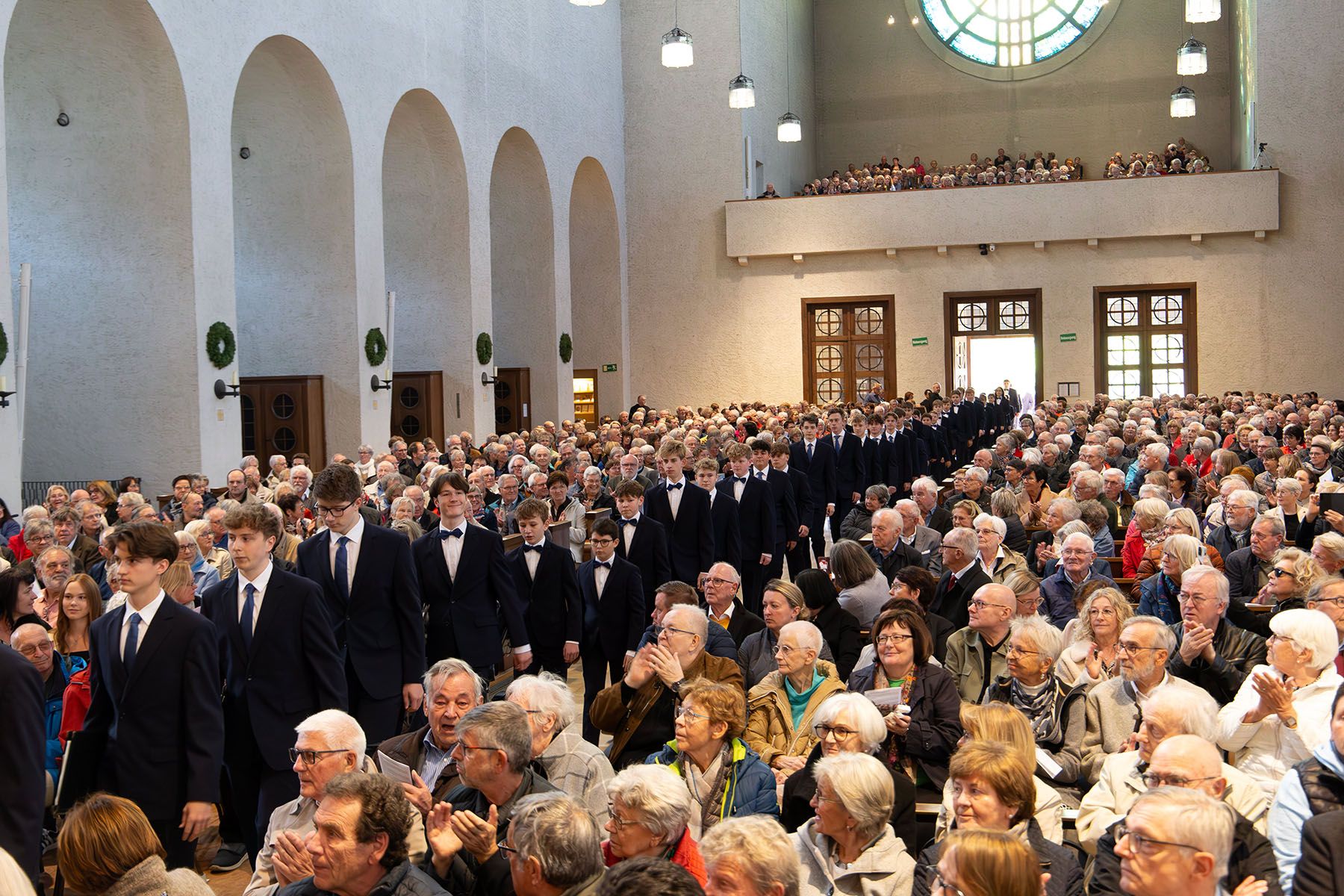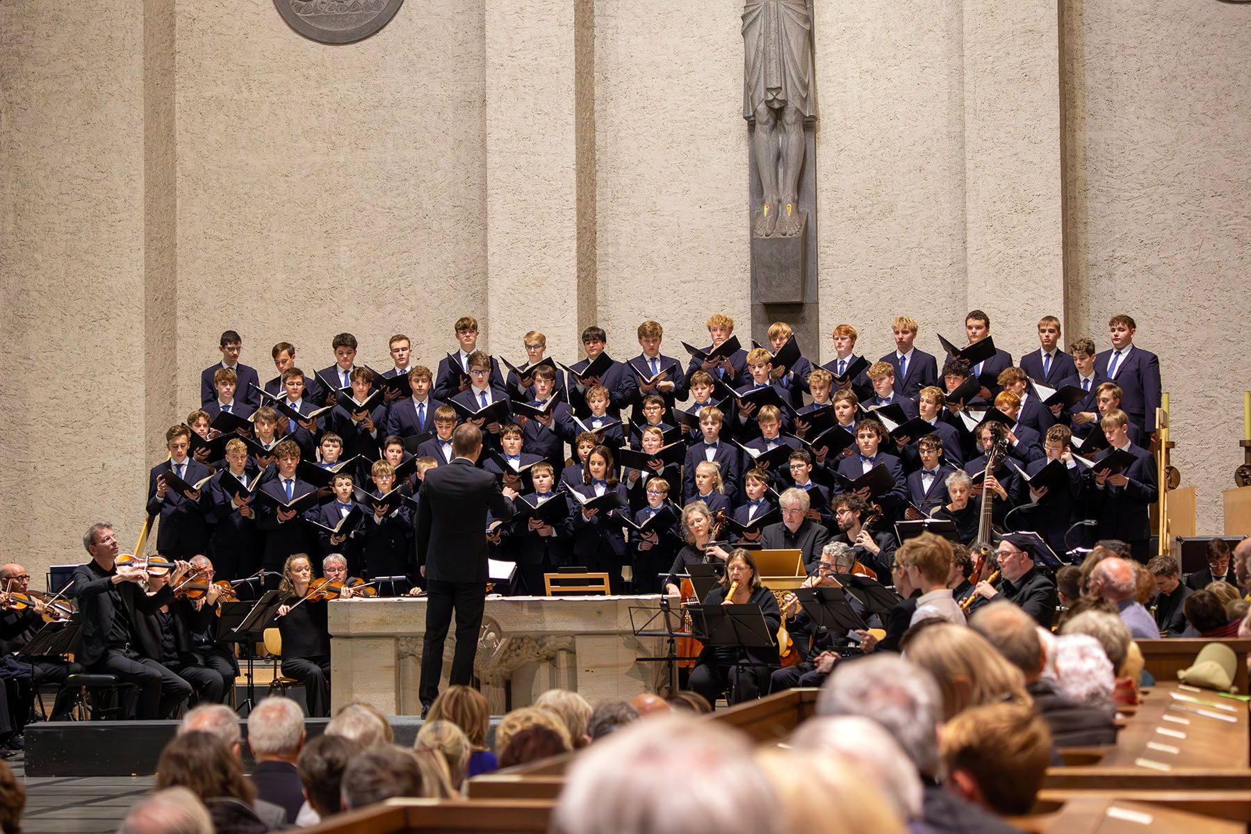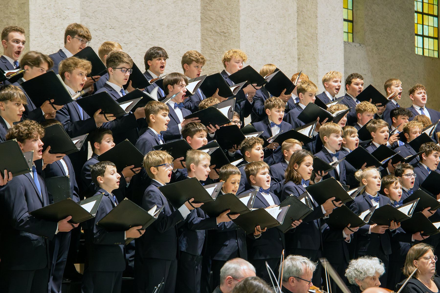 Nach dem Einzug des Windsbacher Knabenchors erklang als erstes Werk „Es erhub sich ein Streit“, das vor allem durch den Einsatz von Pauken und Trompeten seinen festlichen Klang entwickelte. Inhaltlich geht es um den Kampf zwischen dem Erzengel Michael und dem Bösen in Form des Drachen. Durch virtuose Koloraturen und einer furchtlosen Harmonik spiegelte sich die Geschichte in der Musik wider.