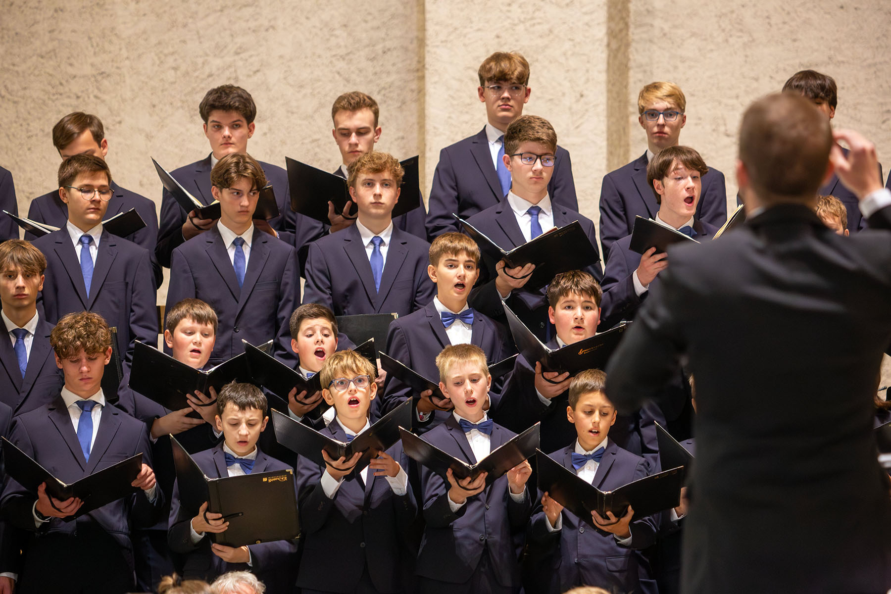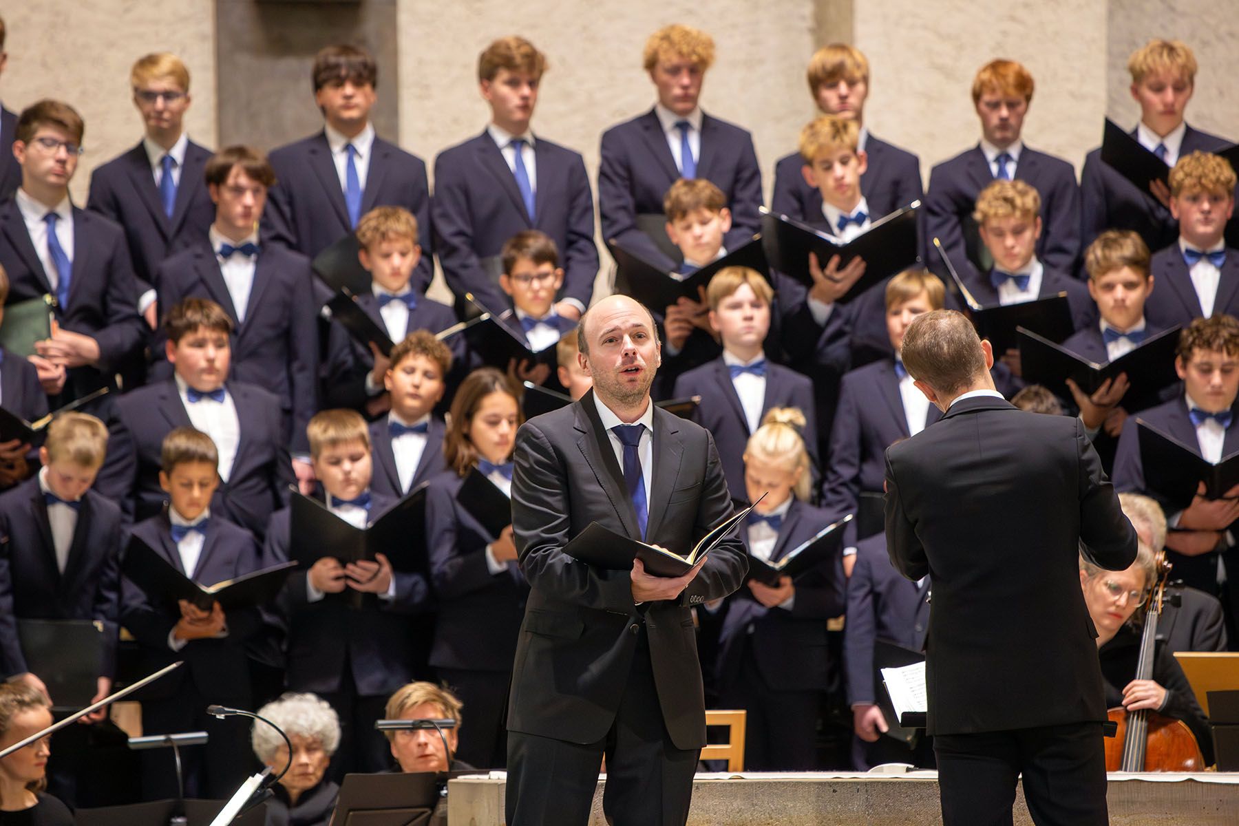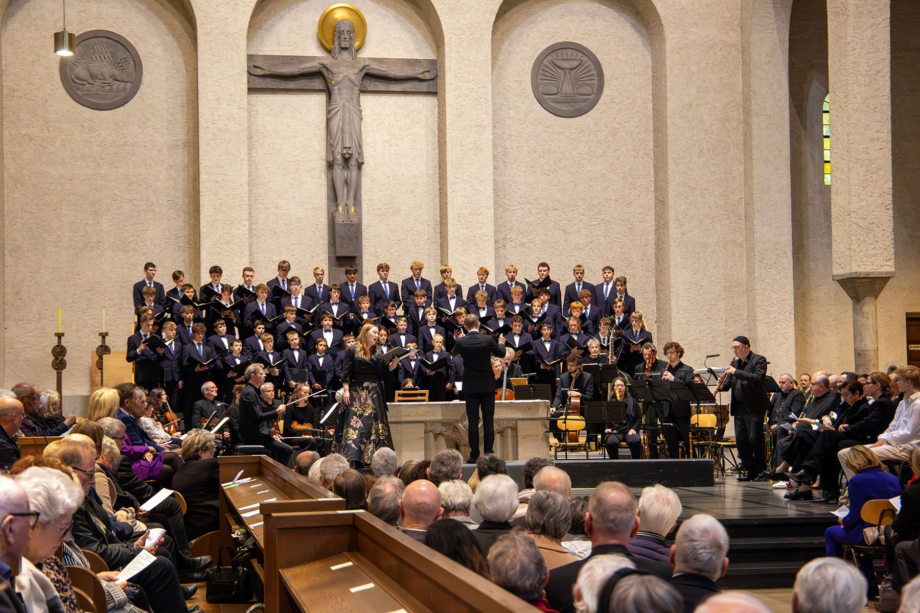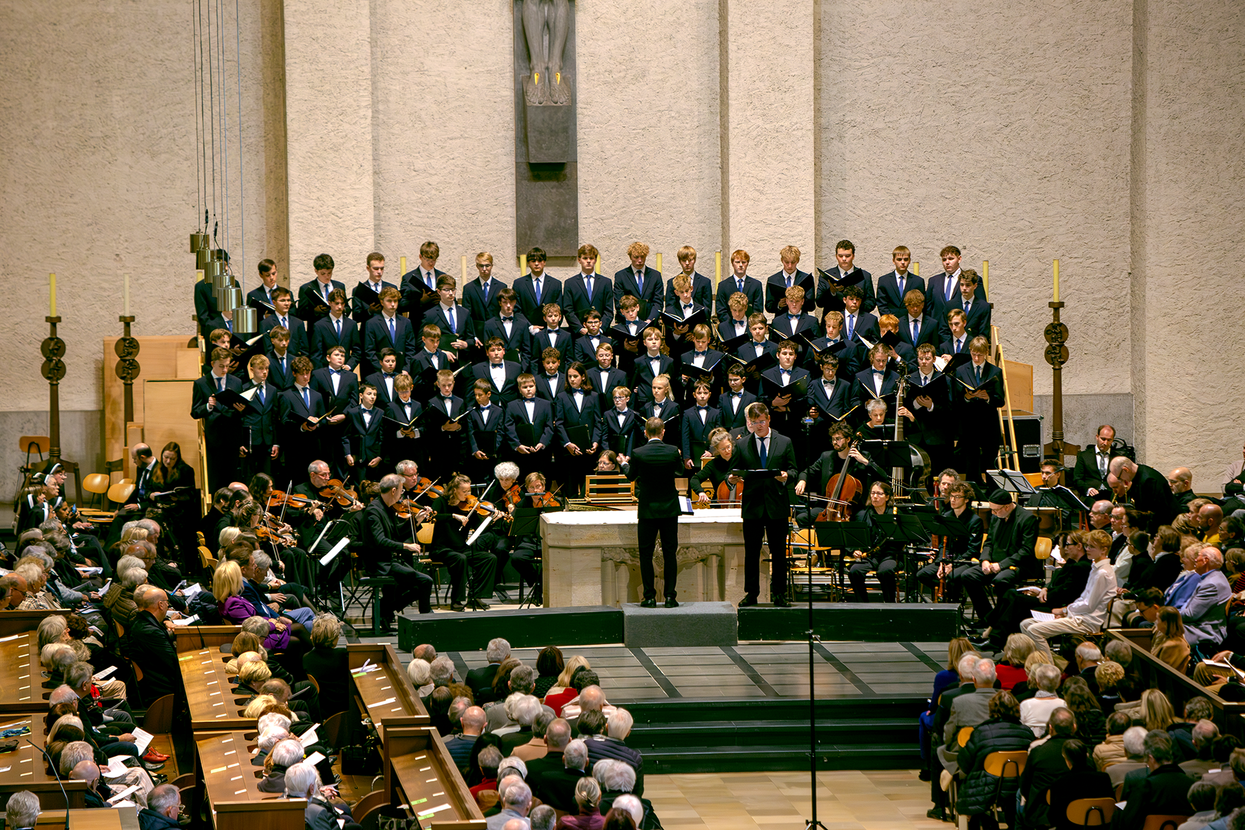 Nach dem Einzug des Windsbacher Knabenchors erklang als erstes Werk „Es erhub sich ein Streit“, das vor allem durch den Einsatz von Pauken und Trompeten seinen festlichen Klang entwickelte. Inhaltlich geht es um den Kampf zwischen dem Erzengel Michael und dem Bösen in Form des Drachen. Durch virtuose Koloraturen und einer furchtlosen Harmonik spiegelte sich die Geschichte in der Musik wider.