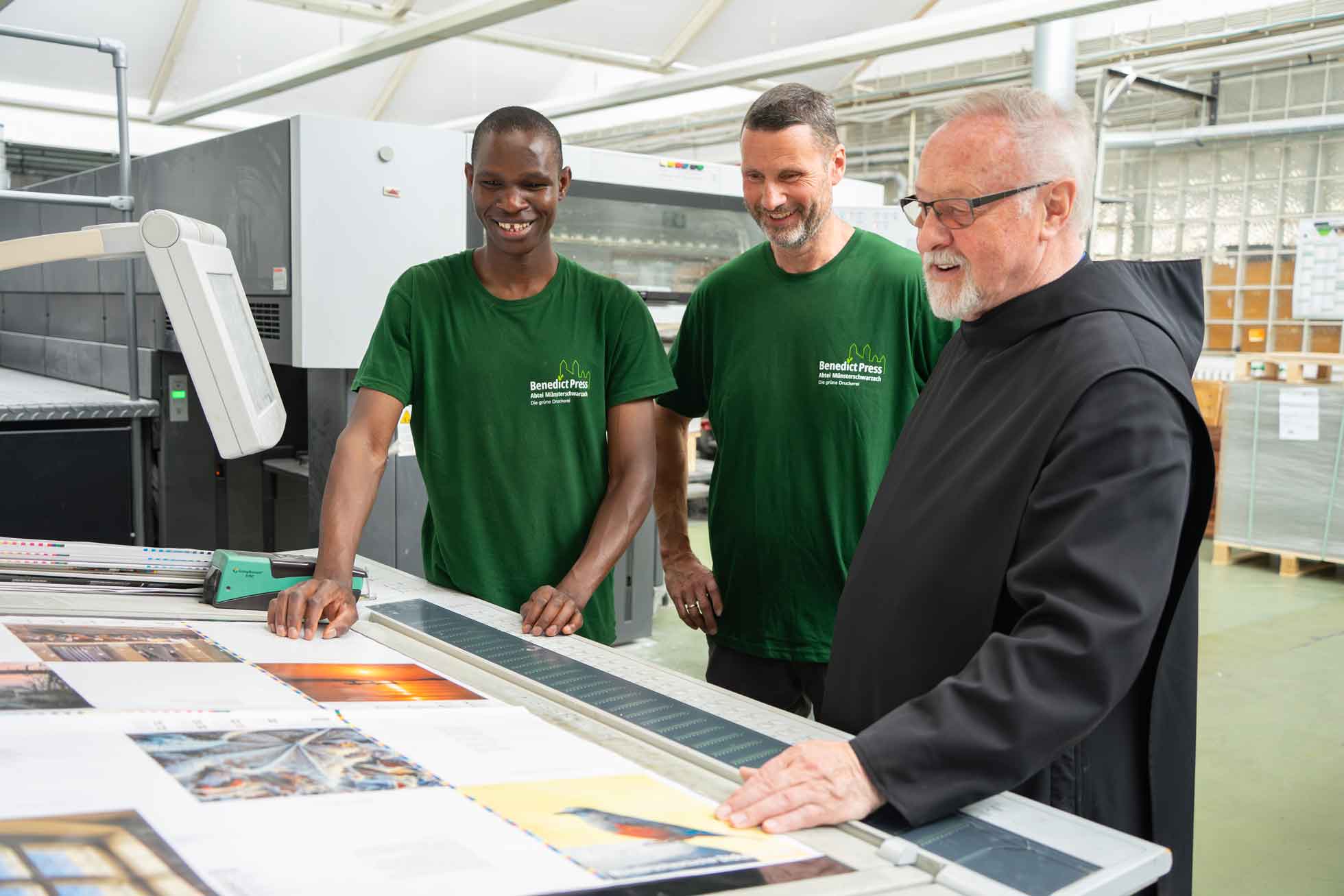 Mit dem Kalender für 2009 übernahm dann Br. Alfred Engert, damals noch Leiter der klostereigenen Druckerei Benedict Press Auswahl von Texten und Bildern. Der zeitliche Vorlauf für die Herstellung ist mit etwa zwei Jahren enorm. „Durch das Internet und viele gute Menschen“ hat Br. Alfred permanent Bilder gesammelt. Ähnlich ist der Sucher und Sammler mit den Texten verfahren. Wichtig sei ihm dabei gewesen, eine gute Mischung aus „geistlichen und nicht zu erhabenen Texten, aus leichten und meditativen Bildern“ zu finden und eine Beziehung zwischen Zitat und Foto herzustellen. Dass die manchmal erst auf den zweiten Blick ersichtlich wird, ist durchaus gewollt. Und auch dass der Betrachtende wie er selbst so manches Zitat „nicht mehr aus dem Kopf bringt“, sei erwünscht. Der schönste Moment war für den gelernten Schriftsetzer und Offsetdrucker, wenn im Dezember die 54 Bilder und Texte auf einem großen Tisch vor ihm lagen: „Dann habe ich gespürt: Jetzt wird’s stimmig!“. Im Januar ging es dann ans Einholen der Rechte, Farbkorrekturen, das Erstellen des Kalendariums und Korrekturlesen bis hin zum Druck: „Eben alles aus einer Hand!“