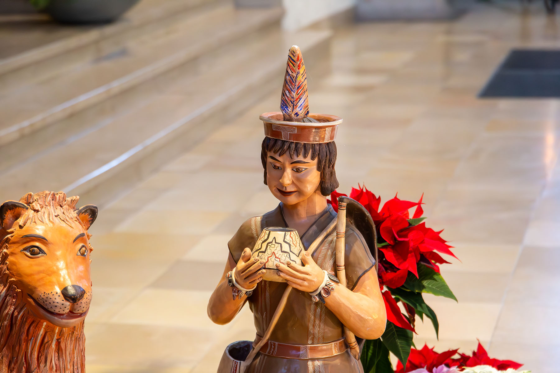 Zur Tradition im Kloster gehören seit vielen Jahren auch ungewöhnliche Krippendarstellungen. „Dieses Mal kommt die Krippe aus Peru, sie ist eine Leihgabe unseres Fair-Handels“, verrät P. Zacharias Heyes. „Sie besteht aus großen gebrannten Tonfiguren, die Menschen vom Volksstamm der Shipiboindianer zeigt.“ Die peruanische Kultur zieht sich dabei als roter Faden durch die Darstellung der Weihnachtsgeschichte.