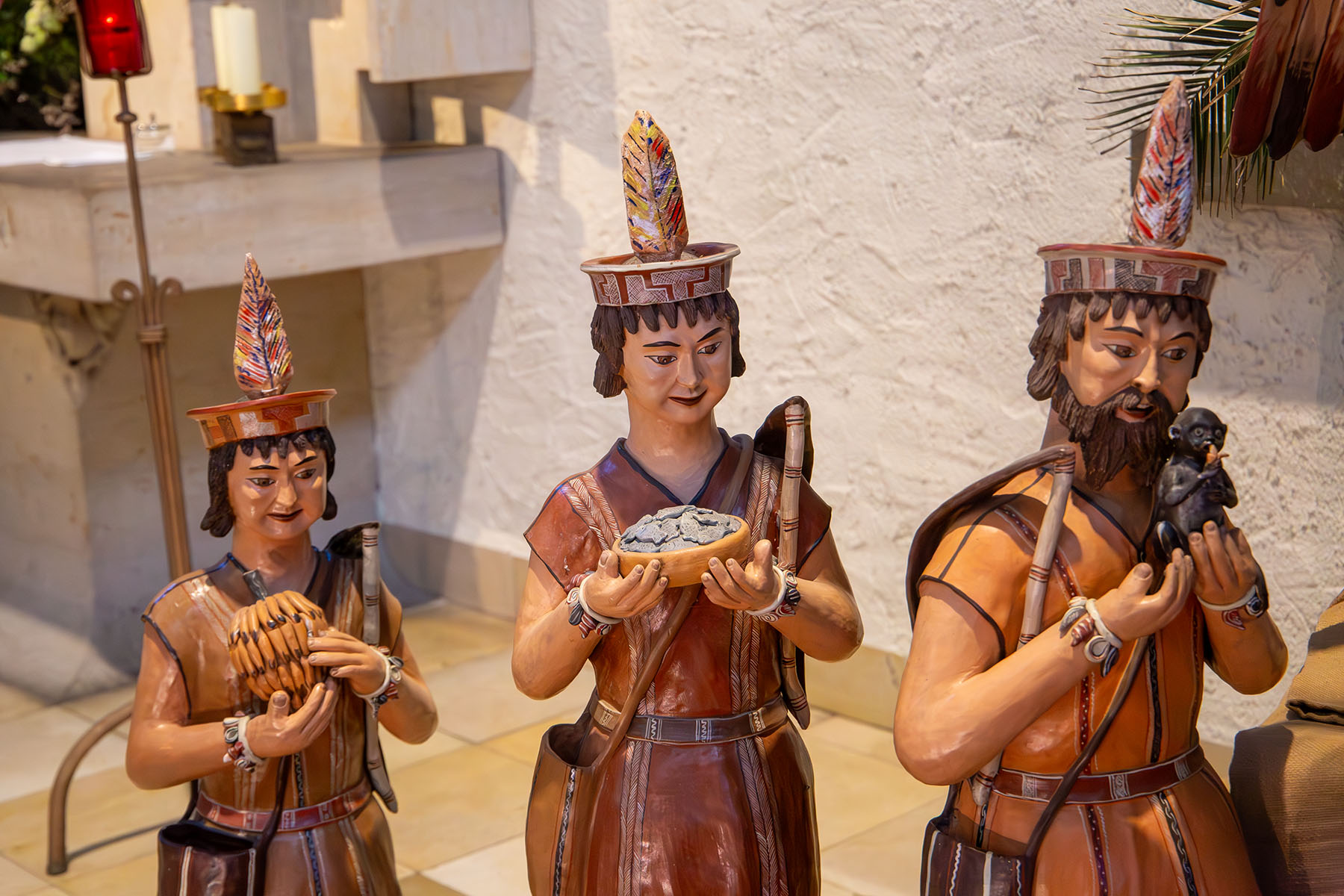 Das lässt sich nicht nur an der Panflöte in der Hand des Engels erkennen. Das Jesuskind liegt auf bunten Blättern statt im Stroh. Die drei Könige haben Fische, Bananen und ein Äffchen als Geschenke dabei. Nicht Esel und Ochse, sondern Löwe und Panther leisten dem Neugeborenen Gesellschaft. Eine Anlehnung an den Propheten Jesaja? Dieser spricht von der friedlichen Koexistenz von Löwe und Kalb, Panther und Ziege – unter einem kleinen Kind. „Dieses Bild ist ein Symbol des Frieden. Wer an Gott glaubt, darf in Frieden leben und diesen auch weitergeben“, erläutert P. Zacharias Heyes.