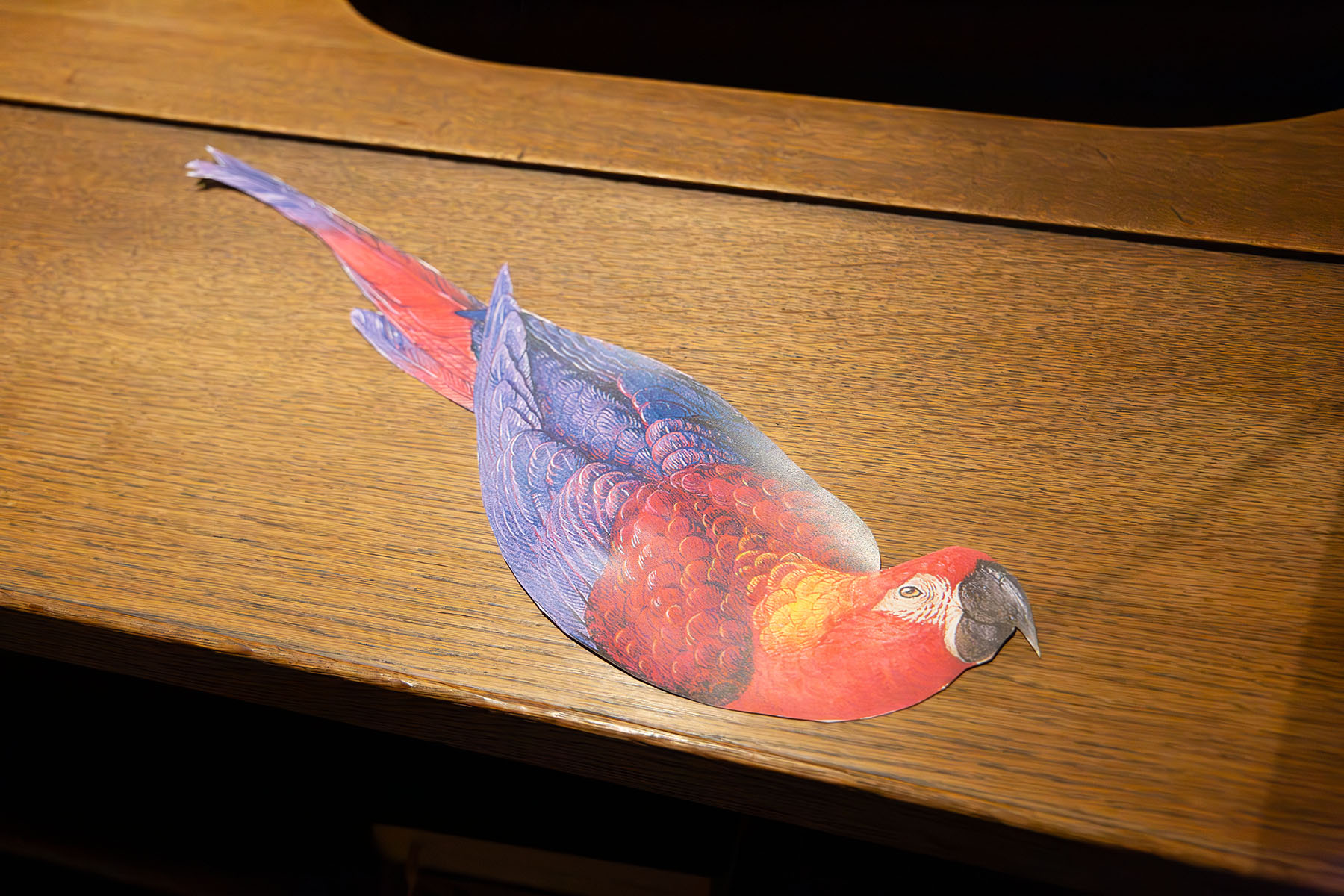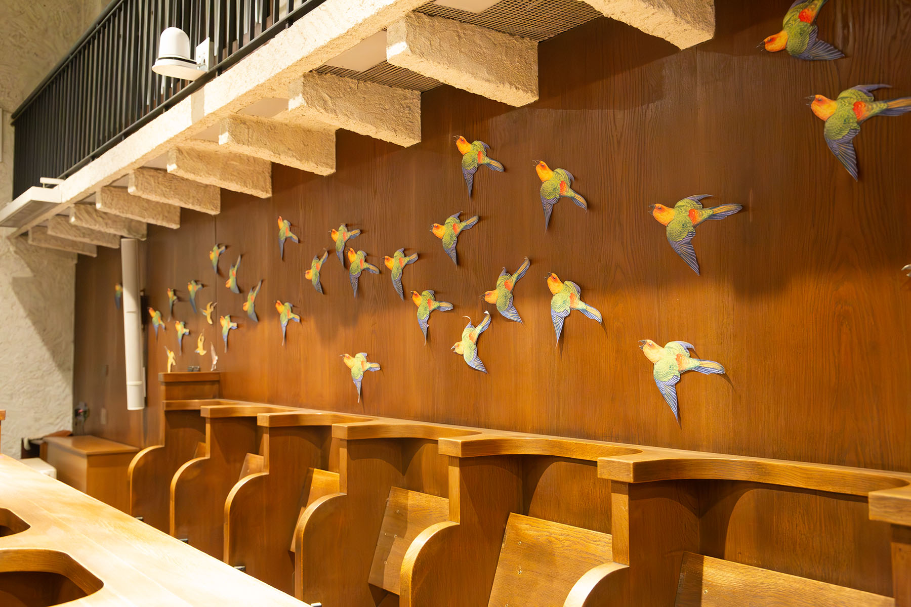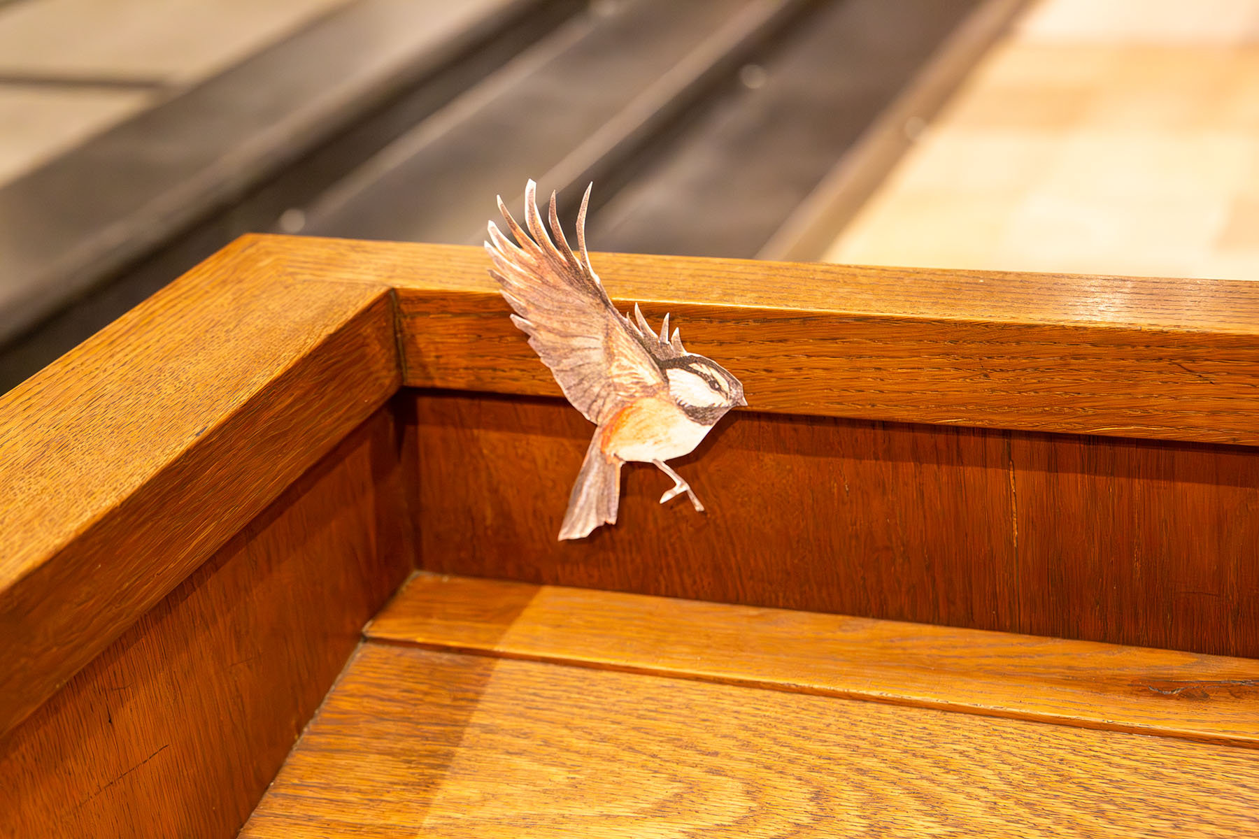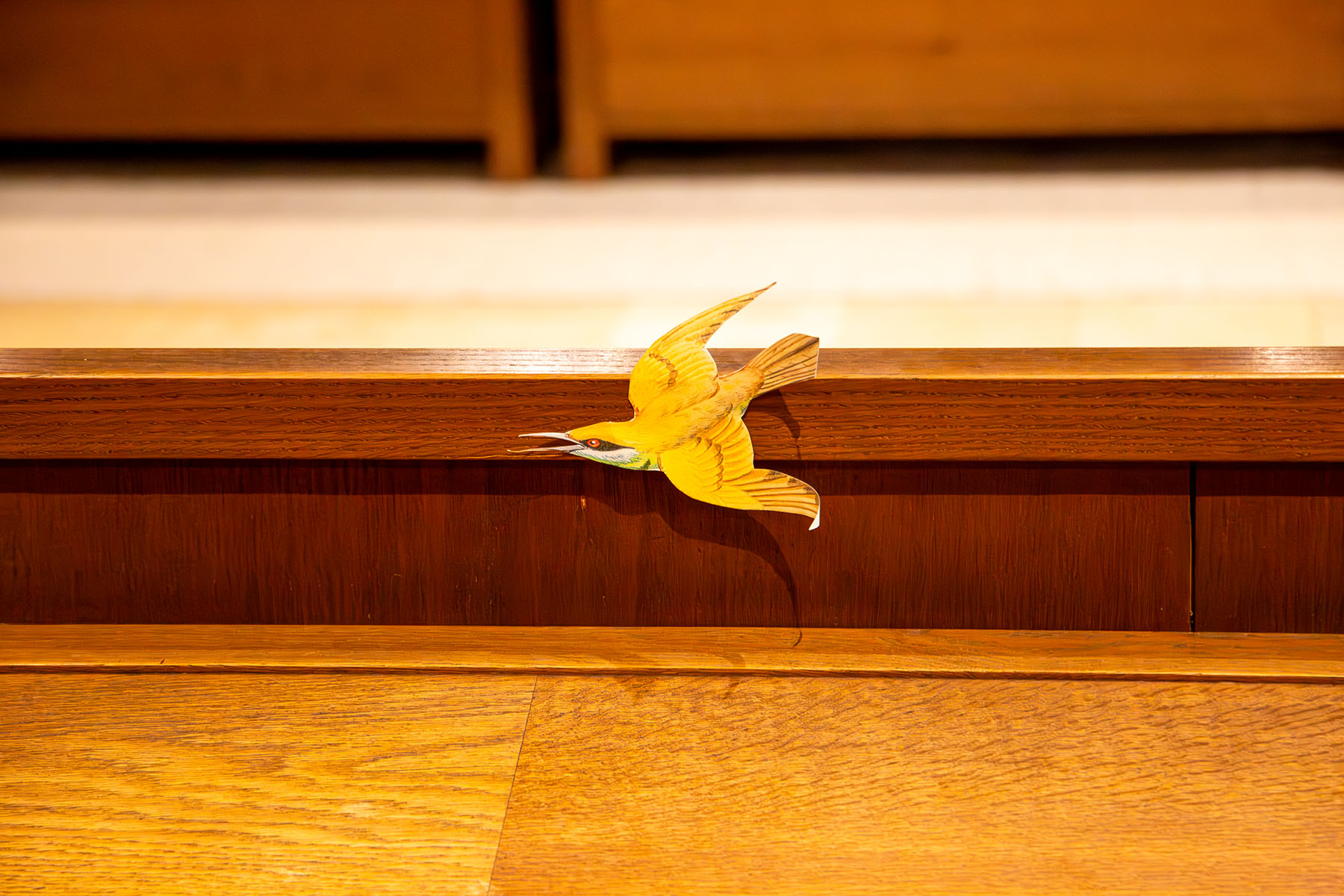 Auch in der Abteikirche lassen sich an diesem Tag Veränderungen feststellen. Das Chorgestühl, manchmal auch der Altarraum, sind geschmückt. In den vergangenen Jahren saßen dort Stofftiere oder schwebten bunte Luftballons. Dieses Mal verwandelte sich der Bereich in ein Vogelparadies. Mit großem Engagement hatte die Beteiligten Dutzende Vögel ausgeschnitten und das Chorgestühl damit dekoriert.