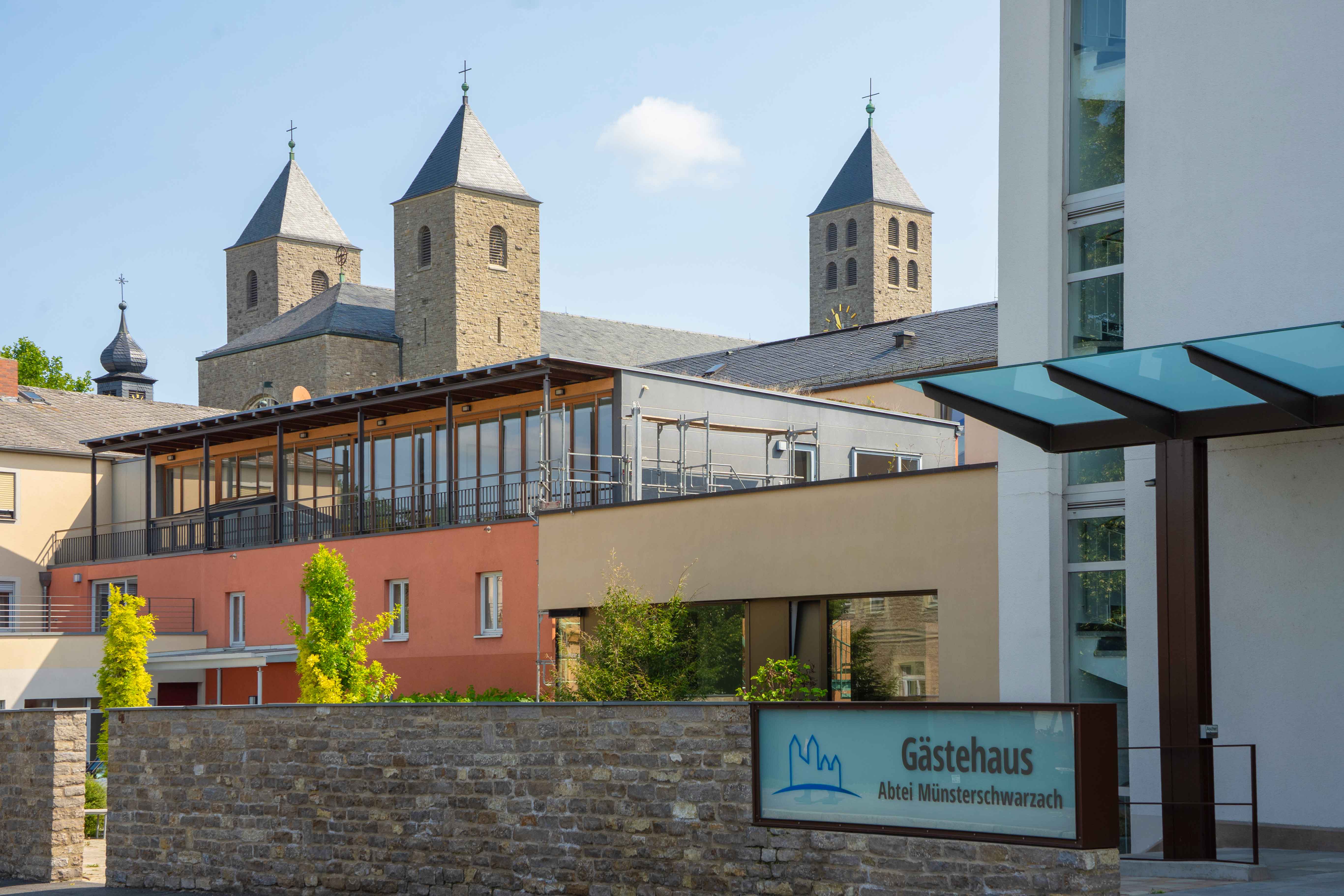 Die Benediktinerabtei Münsterschwarzach ist ein Kloster, in dem ca. 80 Mönche leben. Die Abtei führt neben Schule und vielen Handwerksbetrieben ein Gästehaus mit 150 Betten. Dem Kloster wird es an Gästen nicht fehlen, das sagt schon der Heilige Benedikt.