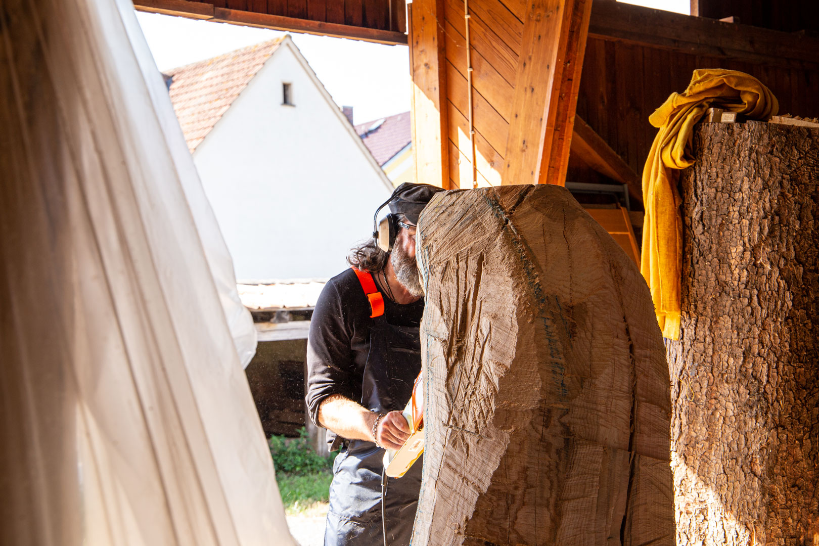 Auf die Abfolge von „Zufällen“ ging er direkt zu Beginn ein: „Und das Wort meine ich wirklich im Wortsinn. An wirkliche Zufälle glaube ich nicht, sondern eher, dass mir etwas zufällt.“ So kam es, dass er im Sommer 2019 einen Bildhauer aus Hamburg kennenlernte, der mit der Kettensäge arbeitete. P. Zacharias war so fasziniert, besuchte ihn und begann selbst damit. Und „zufällig“ wurden nach seiner Rückkehr große Bäume auf dem Abteigelände gefällt, aus denen er etwas Neues fertigen wollte. Und „zufällig“ sollte er dann für 2022 die Krippe in der Abteikirche gestalten. Die Bestimmung der Bäume war klar.