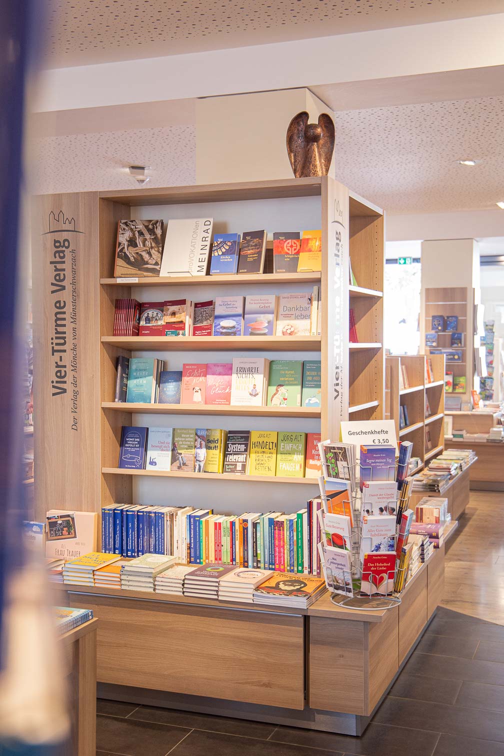 Mehr als eine Buchhandlung - so lässt sich "Buch und Kunst im Klosterhof" am besten beschreiben. Der große Klosterladen lädt seit Jahren Gäste und Touristen zum Stöbern ein. Herausragend vor allem die große Auswahl an Literatur zum geistlichen Leben und zur Liturgie, die persönlichen Empfehlungen aus dem Team der Buchhändlerinnen und Buchhändler, das Sortiment an Büchern aus dem klostereigenen Vier-Türme-Verlag und vom Münsterschwarzacher Mönche P. Anselm Grün. Ein besonderes Highlight ist außerdem der Bereich der Kinder- und Jugendbücher oder die vielen Tonies.