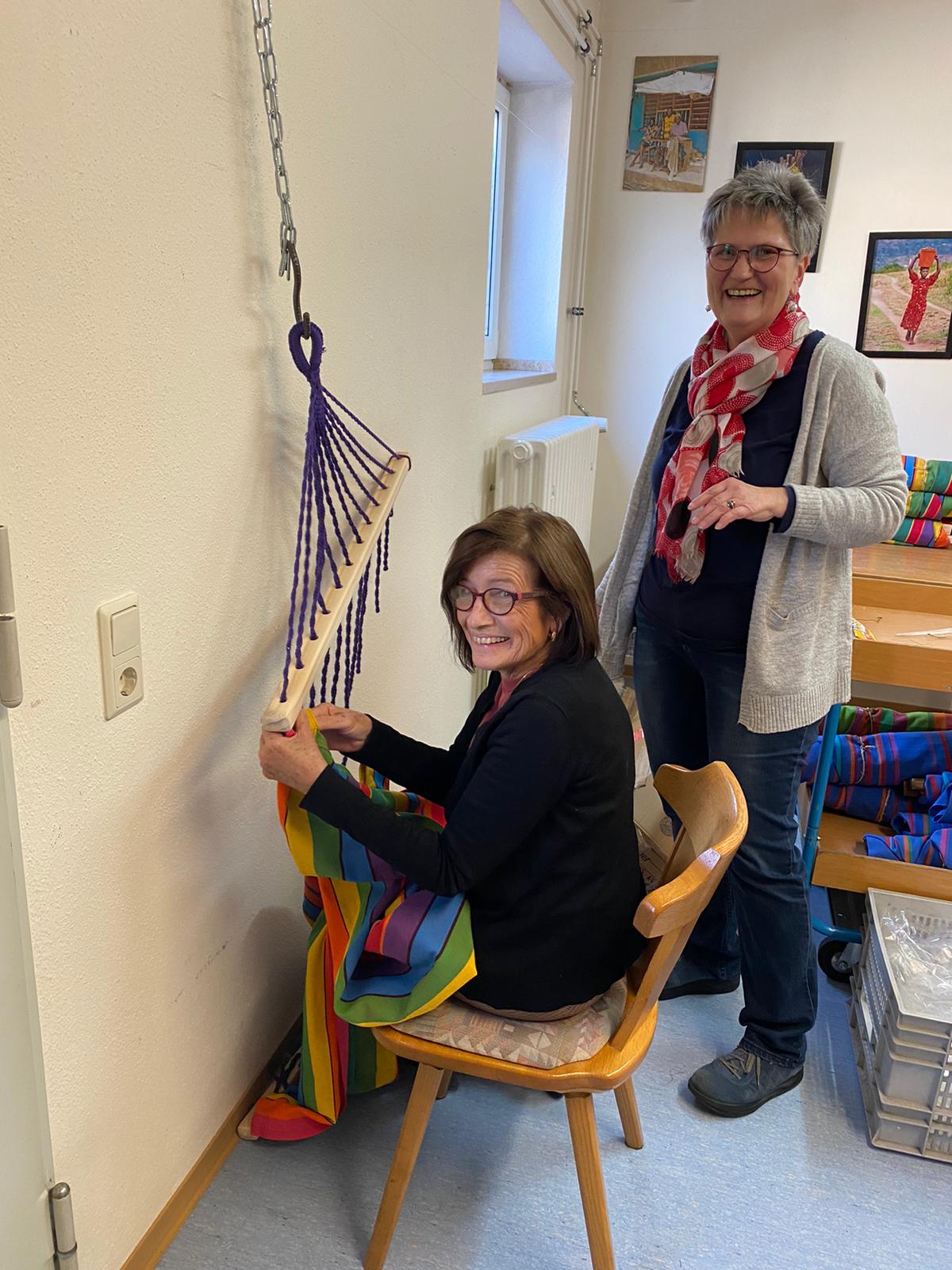 Elena ist die Chefin von Exporsal und normalerweise treffen wir sie nur einmal im Jahr auf der Ambiente-Messe in Frankfurt, um neue Bestellungen aufzugeben. Dieses Jahr jedoch war sie kurz vor der Messe das erste Mal in Münsterschwarzach und konnte uns zeigen, wie die Herstellung von den farbenfrohen Hängematten und -sitzen funktioniert.