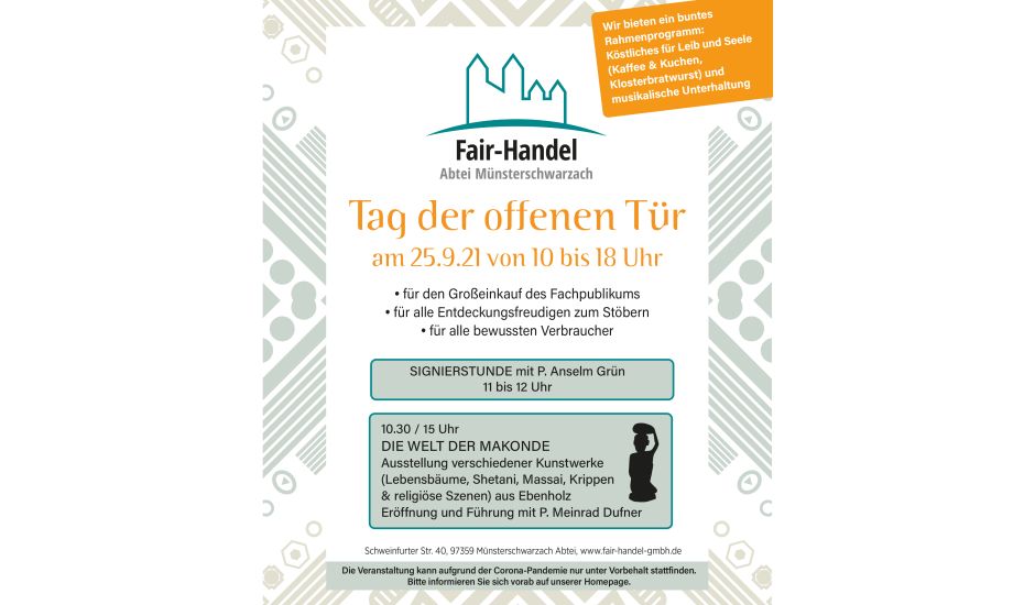 Der Fair-Handel der Abtei Münsterschwarzach lädt am 25. September von 10 bis 18 Uhr zum Tag der offenen Tür mit Produzentenbesuchen ein. An den...
