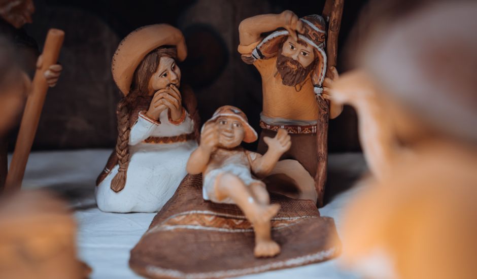 Maria und Josef legen ihre schützenden Hände über das Jesuskind. Krippendarstellung aus Peru der Künstlerkooperative Raymisa.
