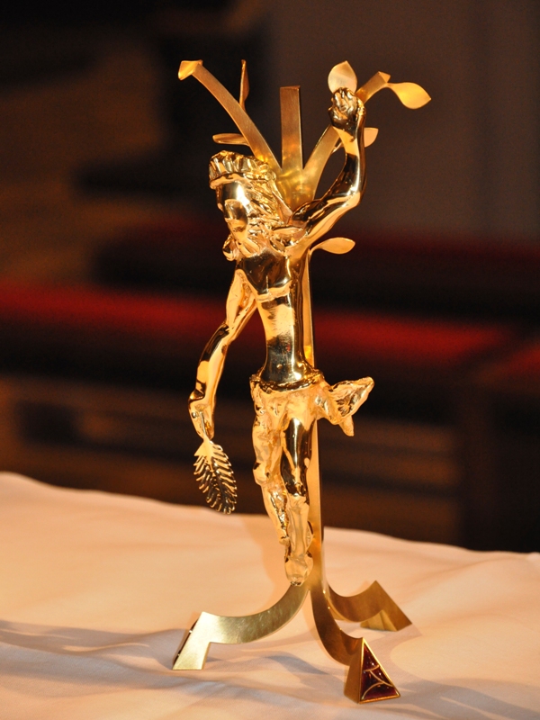 Gleich einem kleinen Lettner wird das Kreuz flankiert von 4 Leuchtern. Sie nehmen die gotische Grundgebärde der Basilika auf. Mit schlanker Grazie tragen sie das vervielfältigte Osterlicht. Ihr Sockel sind jeweils drei Beine. Alle guten Dinge sind drei. Ein Leben aus Glaube, Hoffnung und Liebe wackelt in Ewigkeit nicht. das eingelassene Rot, Farbe von Blut und Hingabe, ist durchlichtet von Fäden der leuchtenden Hoffnung" (Aus der Kreuzerhöhungspredigt von P. Meinrad Dufner OSB)