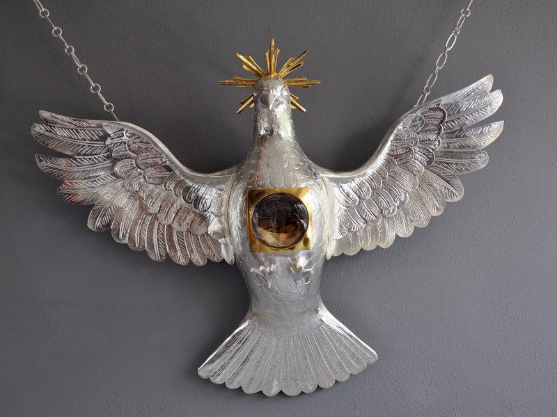 Der in aufwändiger Handarbeit getriebene und ziselierte Vogel hängt schwebend an zwei Ketten über dem Altar.
