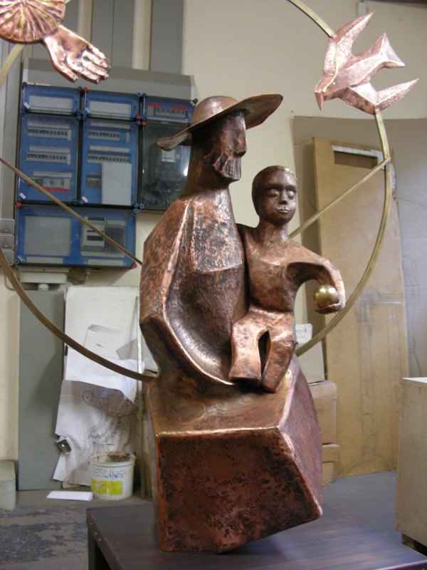 Fast zwei Meter groß aus Kupfer getrieben ragen die Figuren in die Höhe. Nach Entwürfen von P. Meinrad schufen die Gold- und Silberschmiede den heiligen Josef, der das Christkind auf dem Schoß hält, umgeben von den vier Elementen.
