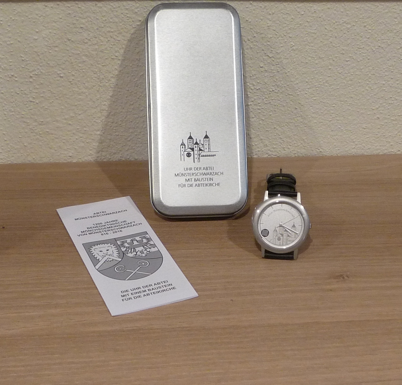 1200 Jahre Benediktinische Mönchsgemeinschaft von Münsterschwarzach sind ein Grund zum Feiern. Aus diesem Anlass wurde eigens eine Uhr designt. Bei der Herstellung dieses besonderen Schmuckstücks ist im Zifferblatt ein kleines Steinchen aus Muschelkalk eingesetzt worden.