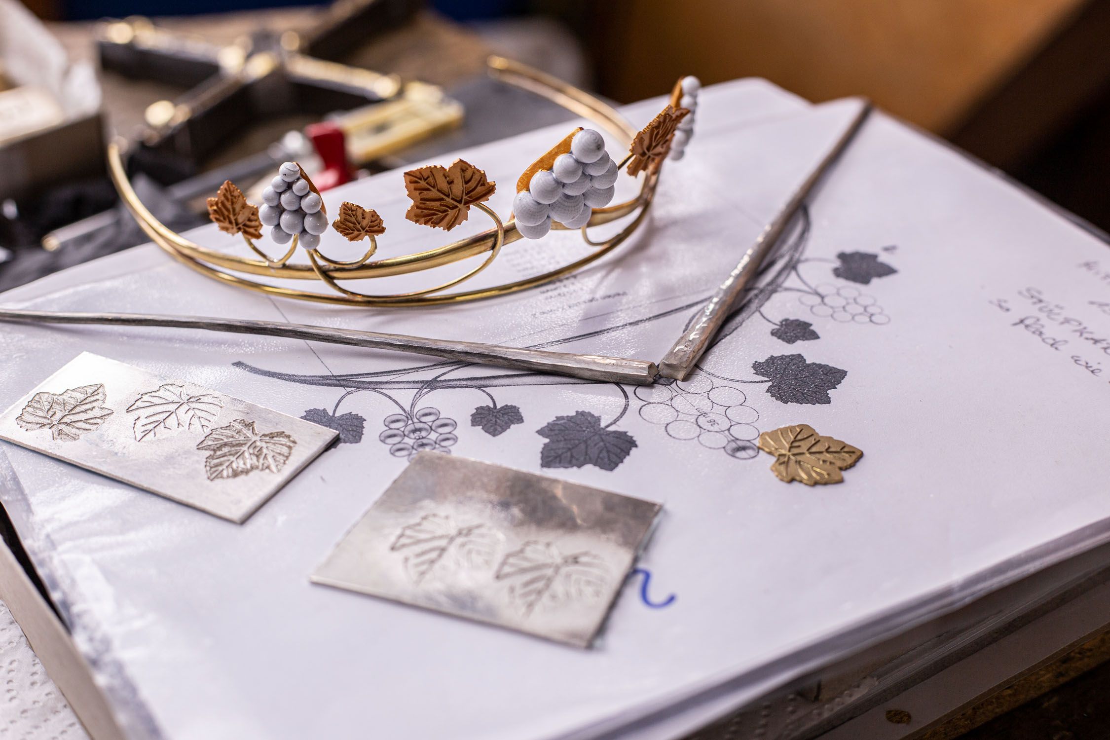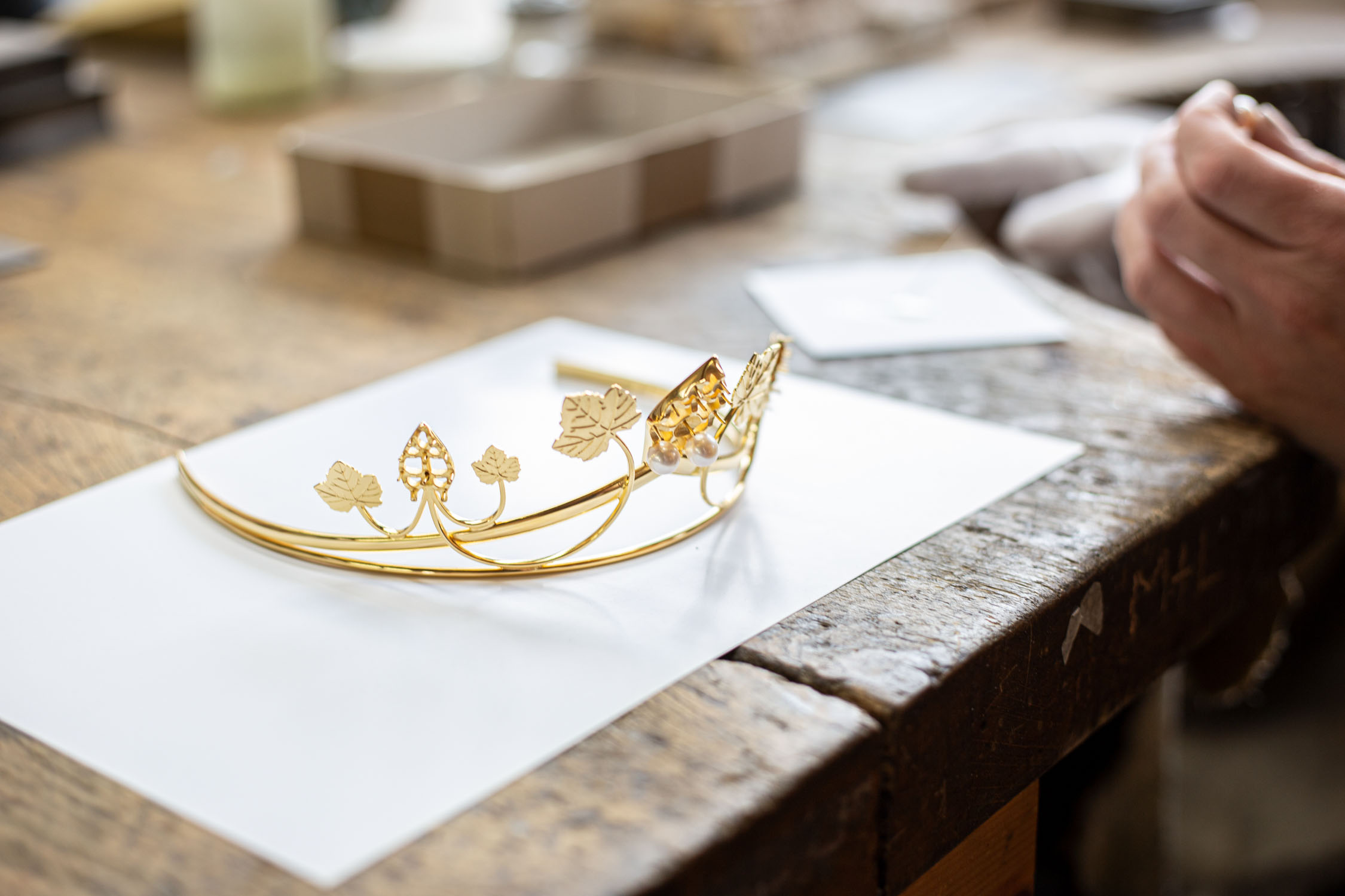 Für die Äste der Weinblätter verwendete Hornung ebenfalls Silberdrähte, allerdings ein Flachprofil zur Stabilität und lötete schließlich Blätter und Träubel an. Nach Versäuberung und Polieren wurde die Jahreszahl der Fertigung per Handgravur in die Rückseite graviert und die Krone konnte galvanisch vergoldet werden. Zum Schluss wurden die Perlen noch in die Fassungen gesetzt.