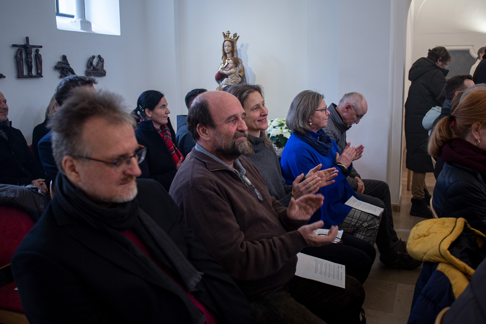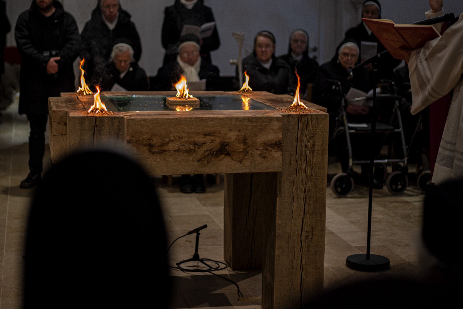Ein besonderer – und auch aufregender – Moment war für die Handwerker der Einsatz im Weihegottesdienst selbst. Nachdem Bischof Franz Jung die Reliquien des heiligen Kilian, der heiligen Teresa von Avila sowie der seligen Alfons Maria Eppinger in den Altar gelegt hatte, wurde die Kapsel mit einer Platte versiegelt und anschließend die Glasplatte auf den Altar gelegt. In einer für alle bewegenden Feier weihte Bischof Franz den Altar, indem er ihn zunächst mit Weihwasser besprengte, mit Chrisamöl salbte und schließlich mit Bauleiterin Sandra Räder zusammen an fünf Stellen Weihrauch entzündete. Danach wurden die Altarkerzen auf den Leuchtern entzündet, die ebenfalls in der Klostermanufaktur gefertigt wurden und sich dadurch auszeichnen, dass sie umsteckbar sind und auch als Evangelienleuchter verwendet werden können.