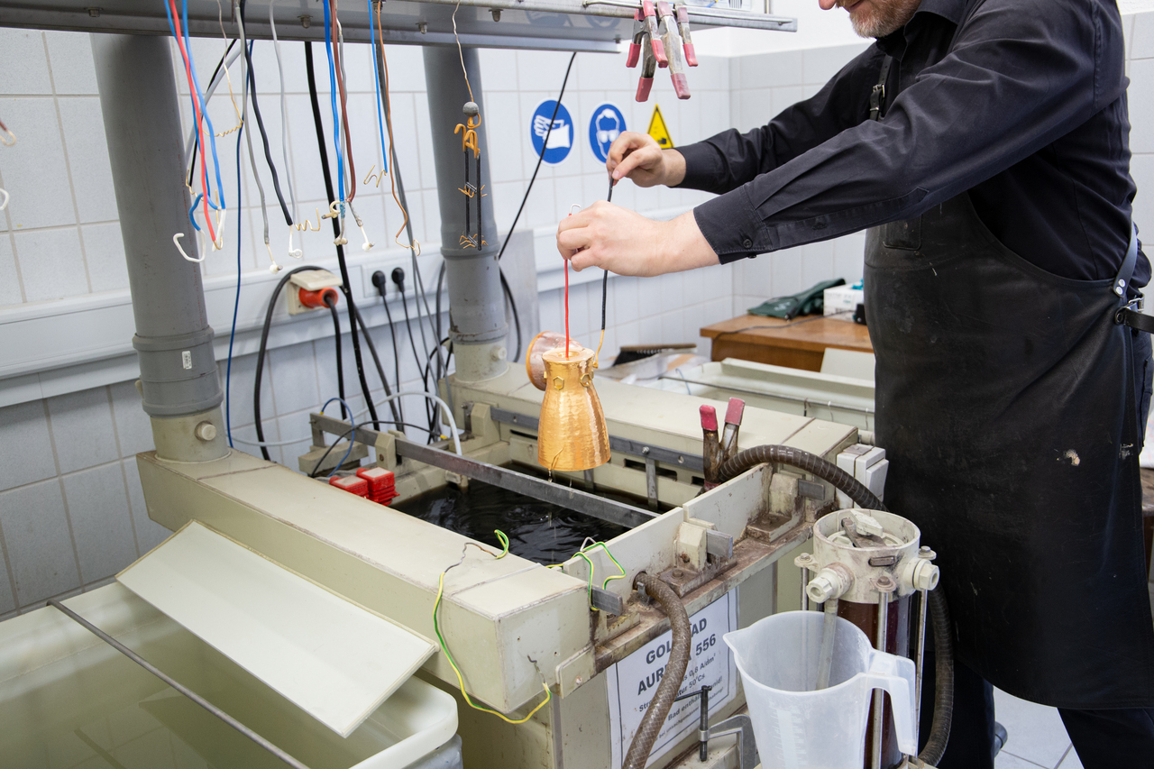 Damit das Gold haften bleibt, wird Strom angelegt. Eine umweltfreundlichere Variante als die frühere Feuervergoldung, bei der mit Quecksilber gearbeitet wird. Die Vergoldung durch die Elektrolyse sorgt zudem für eine gleichmäßige Oberfläche. Auch die meisten eingearbeiteten Edelsteine sind kein Problem: „Durch sie fließt kein Strom und sie sind resistent gegenüber Chemikalien.“ Die meisten zumindest. Bei manchen käme es aber vor, dass sie reagieren und sich verfärben. Aber das erkenne man vorher.