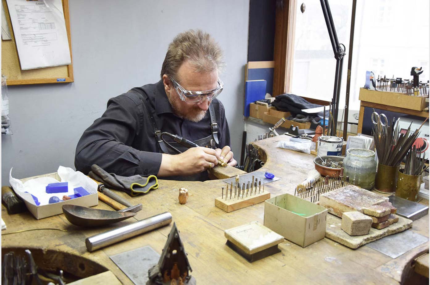 Dass das Betriebsklima in der Gold- und Silberschmiede sehr gut ist, bemerkt man sofort. Jurowski erklärt, dass der Beruf des Gold- beziehungsweise Silberschmiedes für jeden, der hier arbeitet der Traumberuf ist.