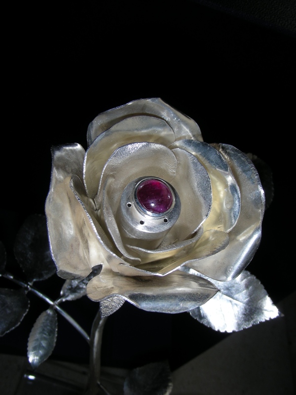Die Rosen bestehen aus Silber und in den Blüten ist ein kleine Dose, die mit Duftöl gefüllt werden kann. Als Abschluss der Dose dient ein Rubin.