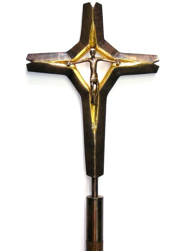 Das Kreuz, in der Mitte aufgebrochen, wurde von Hand aus Messing getrieben und geschweißt. Die Oberfläche wurde auf Bronze gebeizt und in den Zwischenräumen blattvergoldet.