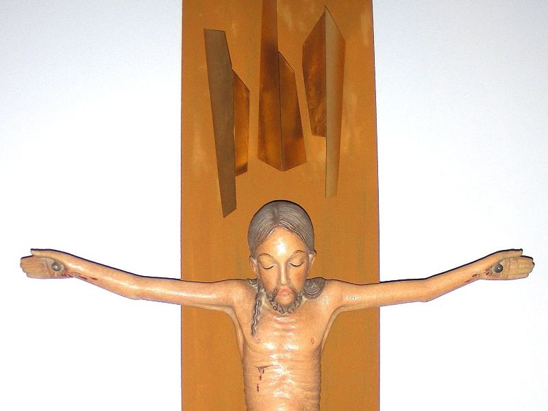 Das moderne Wandkreuz aus der Klostergoldschmiede hängt in Südindien in einem Meditationsraum des Benedict Ashram VIJAYAWADA in Andhra Pradesh in Südindien. Der handgeschnitzte und gefasste Korpus nach romanischem Vorbild aus dem Grödner Tal wird gehalten von einer gespannten Fläche aus verrostetem Stahl. Über dem Korpus schwebt die symbolisierte Dornenkrone aus Messing, vergoldet.