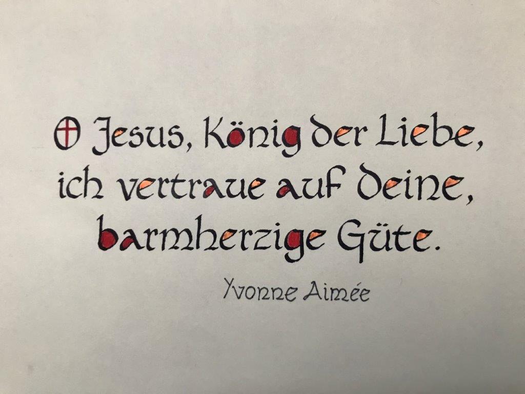 Dieses Stoßgebet stammt von Mutter Yvonne Aimee (1901 - 1951) Sie war eine Augustiner-Chorherrin und lebte als Ordensfrau in der Bretagne. 1927 wurde es durch Buchzeichen verbreitet. Es sollte jeden Morgen und Abend gebetet werden. 1958 weitete es Papst Johannes XXIII auf die ganz Weltkirche aus.