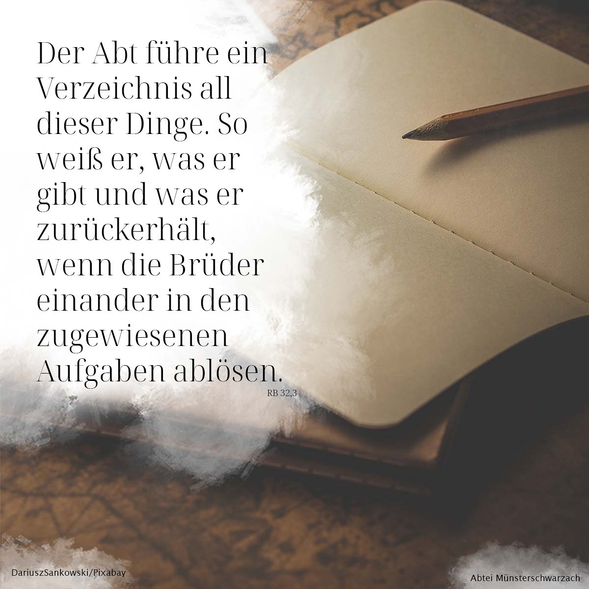 3. Der Abt führe ein Verzeichnis all dieser Dinge. So weiß er, was er gibt und war er zurückerhält, wenn die Brüder einander in den zugewiesenen Aufgaben ablösen.