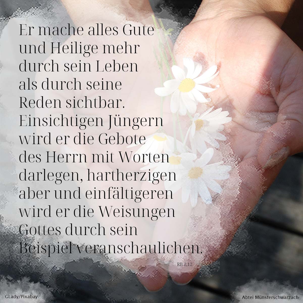 12. Er mache alles Gute und Heilige mehr durch sein Leben als durch sein Reden sichtbar. Einsichtigen Jüngern wird er die Gebote des Herrn mit Worten darlegen, hartherzigen aber und einfältigeren wird er die Weisung Gottes durch sein Beispiel veranschaulichen.