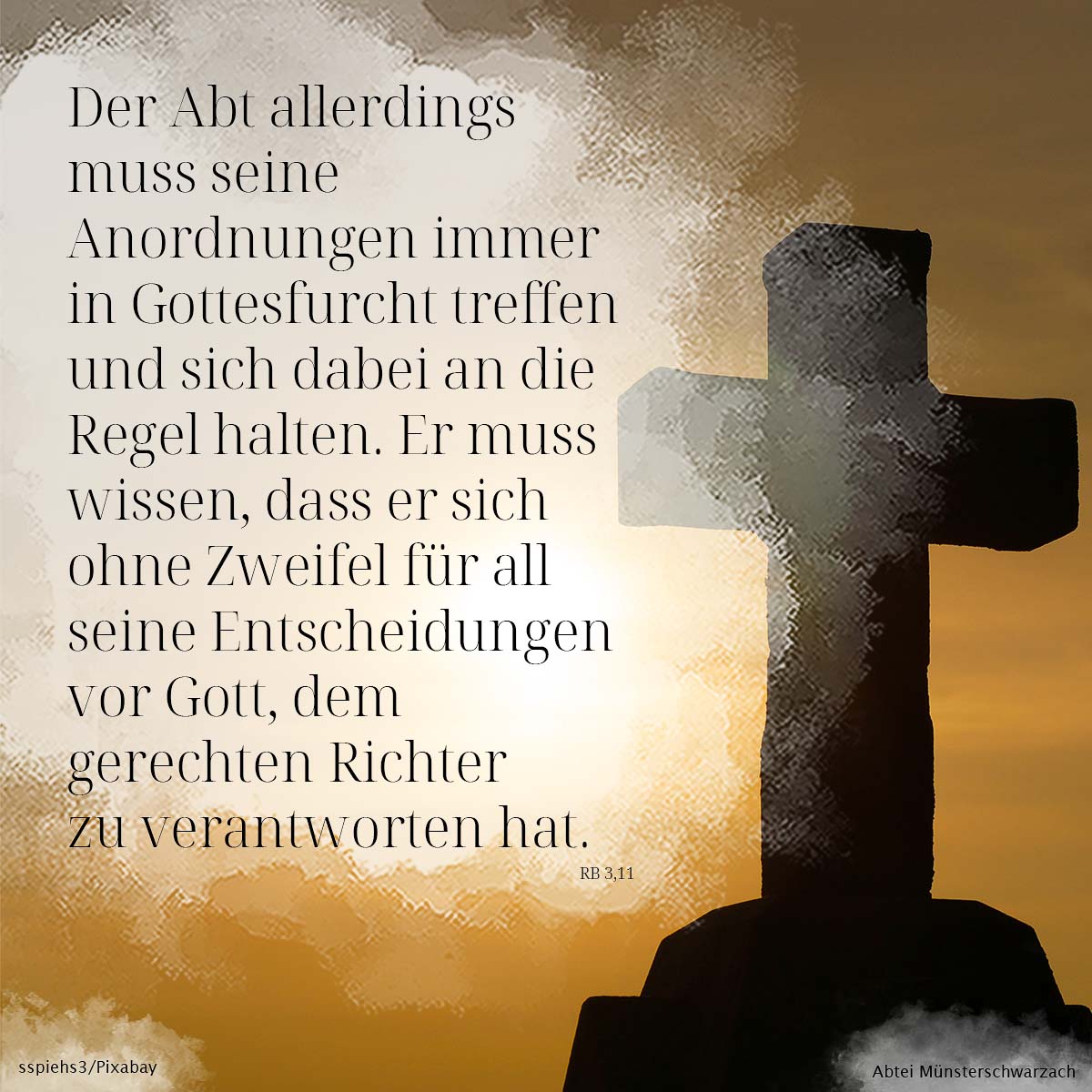 11. Der Abt allerdings muss seine Anordnungen immer in Gottesfurcht treffen und sich dabei an die Regel halten. Er muss wissen, dass er sich ohne Zweifel für all seine Entscheidungen vor Gott, dem gerechten Richter, zu verantworten hat.