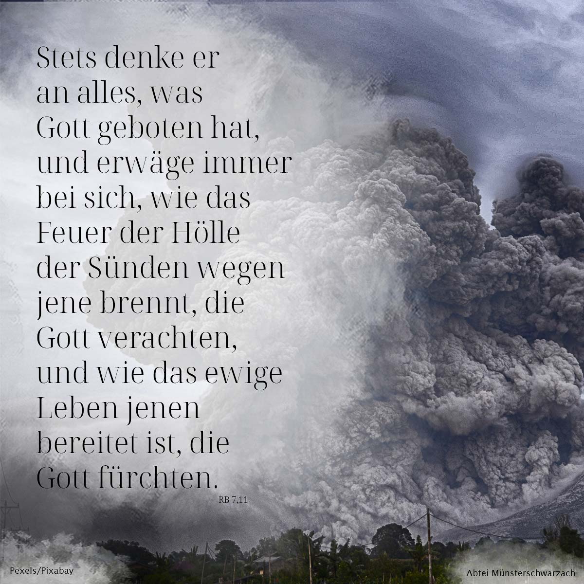 11. Stets denke er an alles, was Gott geboten hat, und erwäge immer bei sich, wie das Feuer der Hölle der Sünden wegen jene brennt, die Gott verachten, und wie das ewige Leben jenen bereitet ist, die Gott fürchten.