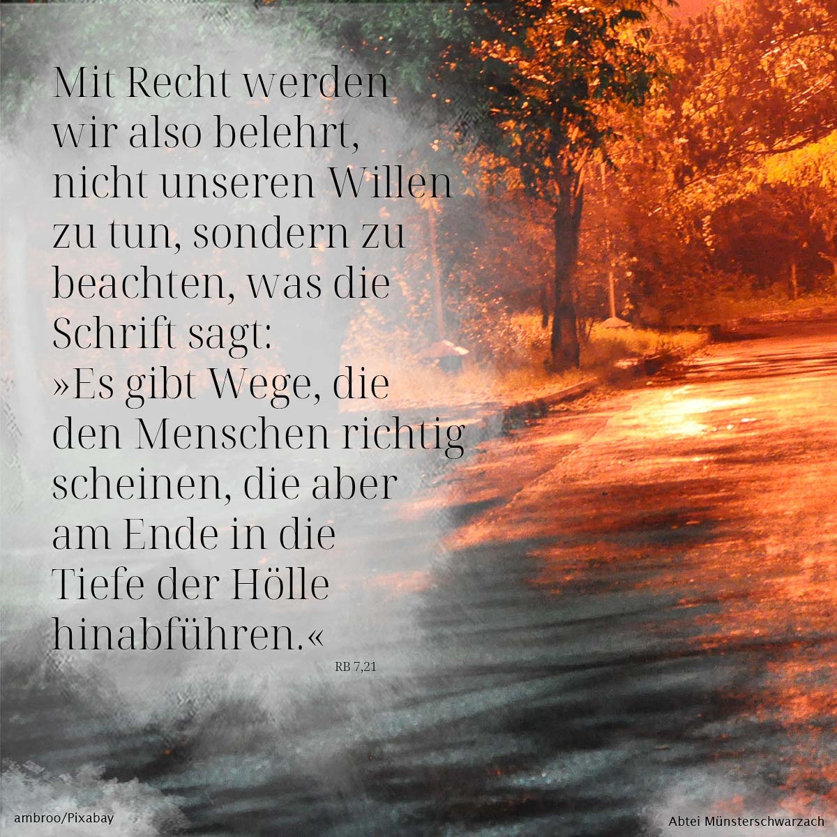 21. Mit Recht werden wir also belehrt, nicht unseren Willen zu tun, sondern zu beachten, was die Schrift sagt: »Es gibt Wege, die den Menschen richtig scheinen, die aber am Ende in die Tiefe der Hölle hinabführen.«
