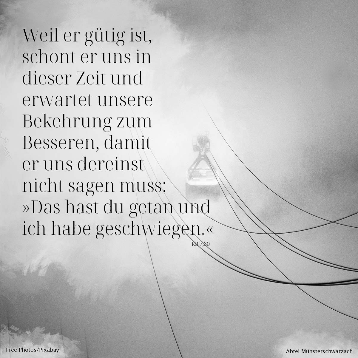 30. Weil er gütig ist, schont er uns in dieser Zeit und erwartet unsere Bekehrung zum Besseren, damit er uns dereinst nicht sagen muss: »Das hast du getan, und ich habe geschwiegen.«