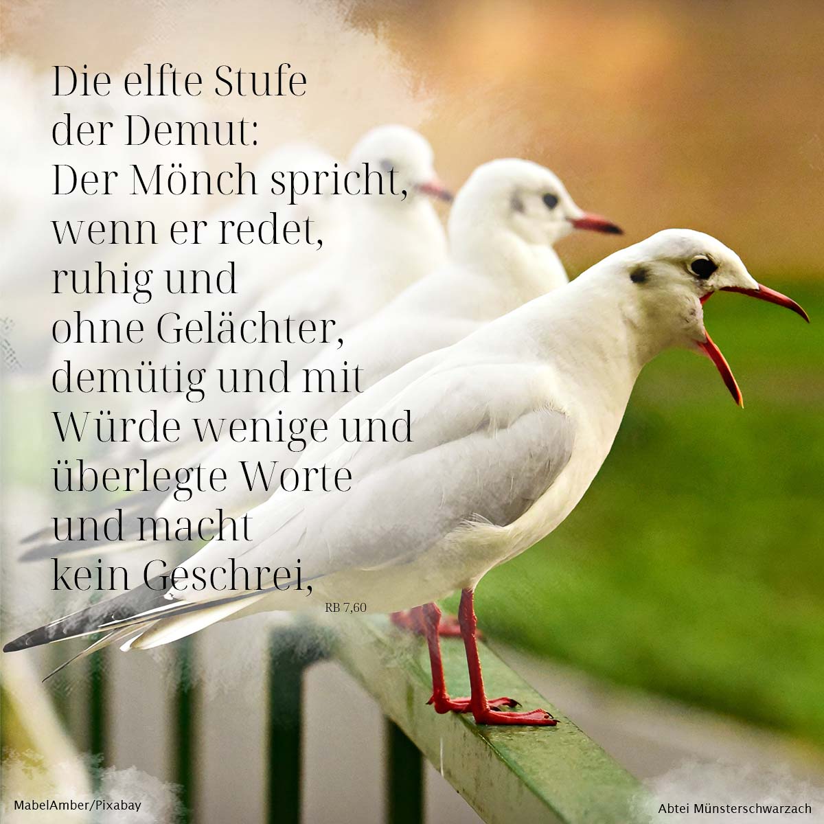 60. Die elfte Stufe der Demut: Der Mönch spricht, wenn er redet, ruhig und ohne Gelächter, demütig und mit Würde wenige und überlegte Worte und macht kein Geschrei.