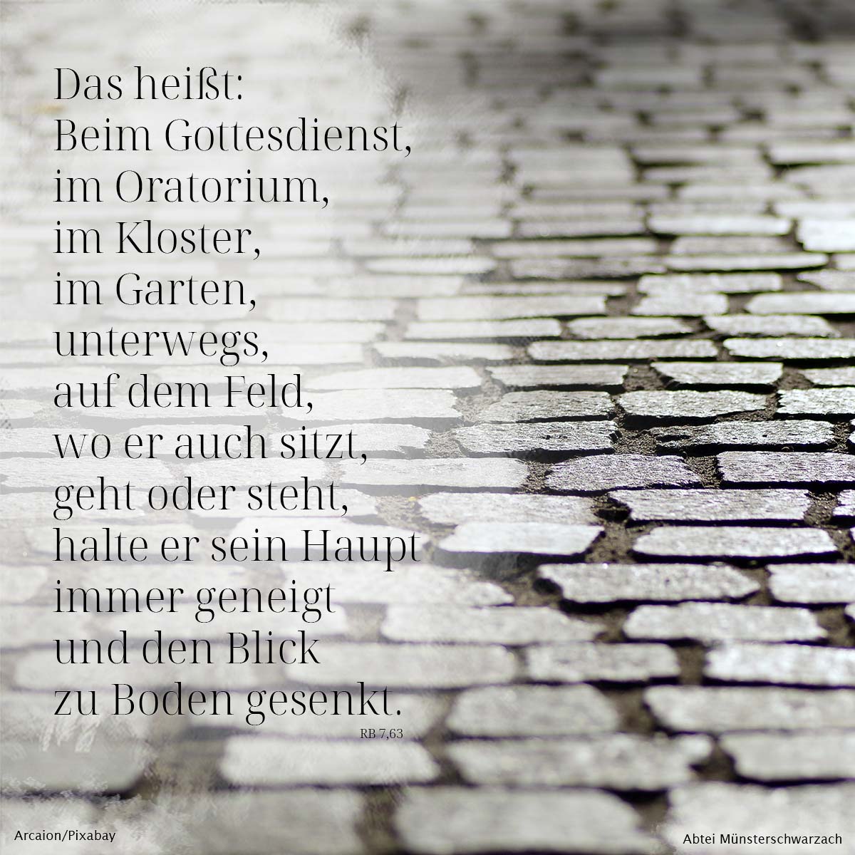 63. Das heißt: Beim Gottesdienst, im Oratorium, im Kloster, im Garten, unterwegs, auf dem Feld, wo er auch sitzt, geht, oder steht, halte er sein Haupt immer geneigt und den Blick zu Boden gerichtet.