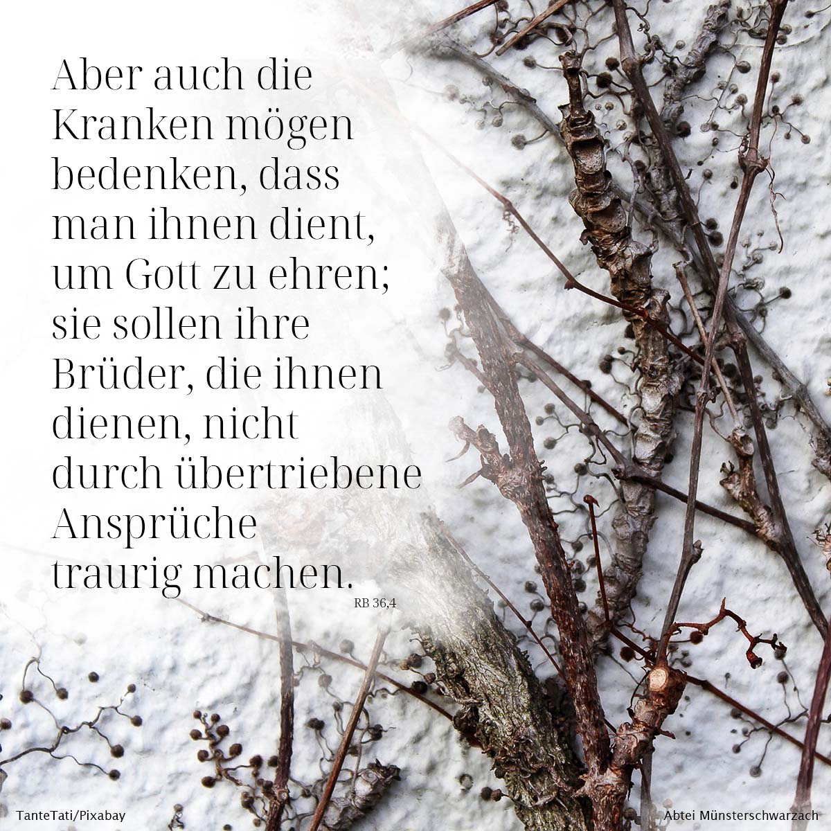 4. Aber auch die Kranken mögen bedenken, dass man ihnen dient, um Gott zu ehren; sie sollen ihre Brüder, die ihnen dienen, nicht durch übertriebene Ansprüche traurig machen.