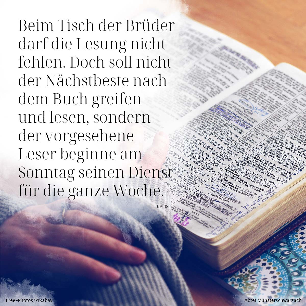 1. Beim Tisch der Brüder darf die Lesung nicht fehlen. Doch soll nicht der Nächstbeste nach dem Buch greifen und lesen, sondern der vorgesehene Leser beginne am Sonntag seinen Dienst für die ganze Woche.