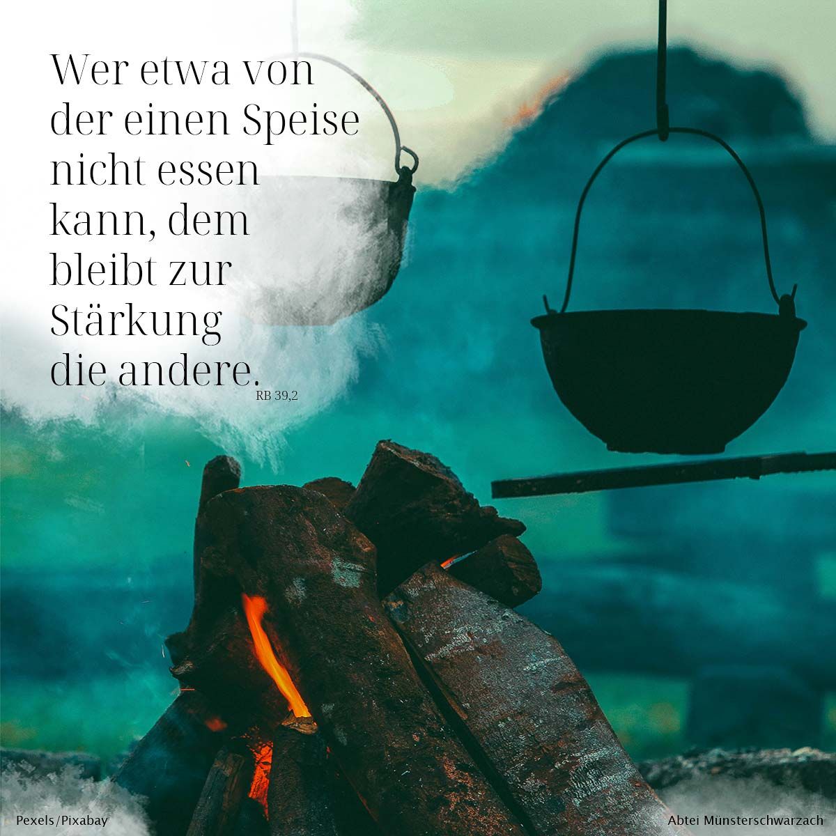 RB 39,2 Benediktsregel 39. Kapitel2. Wer etwa von der einen Speise nicht essen kann, dem bleibt zur Stärkung die andere.Unverträglichkeiten wurden schon damals von Benedikt berücksichtigt.Jeder wird versorgt, jeder soll gestärkt werden.