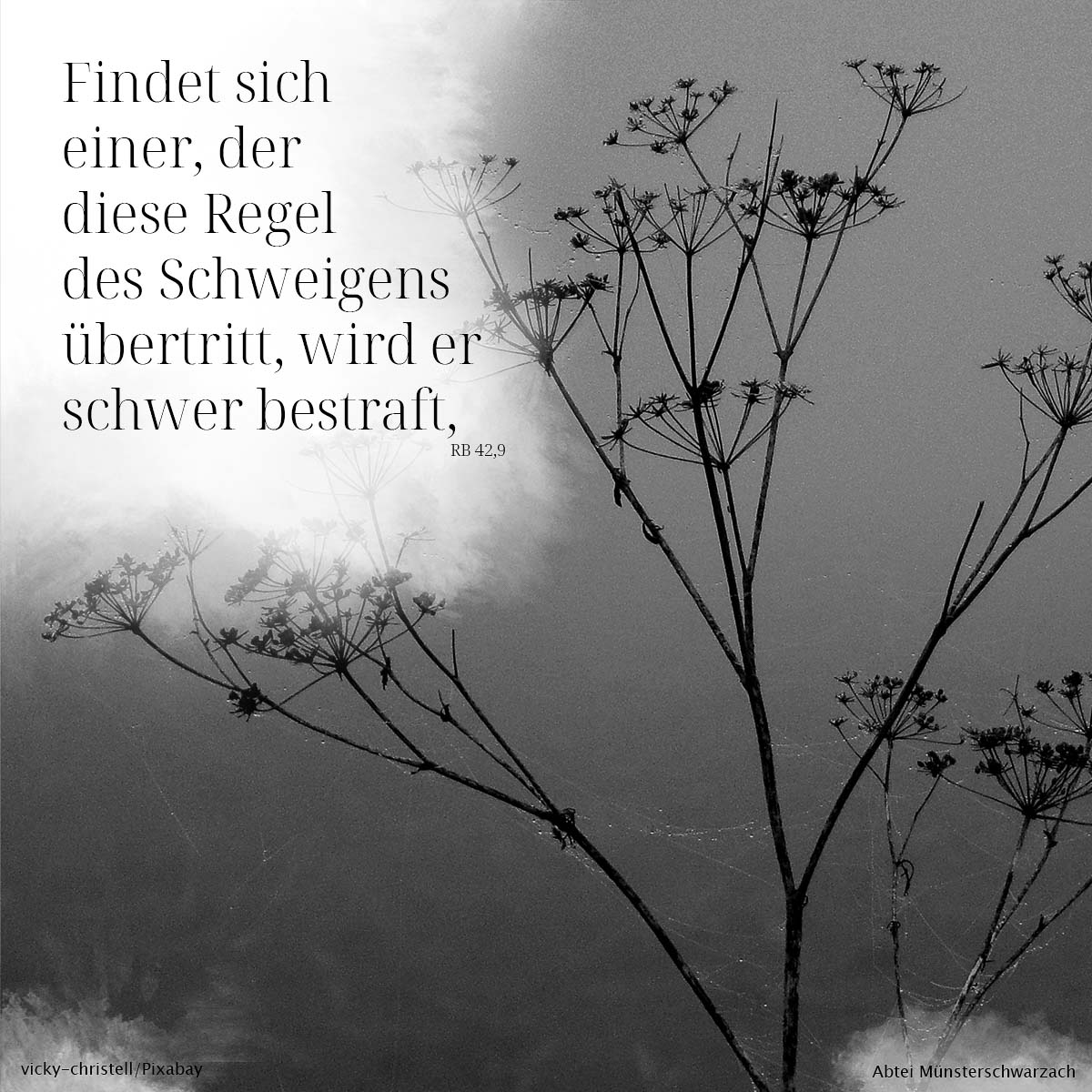 RB 42,9 Benediktsregel 42. Kapitel 9. Findet sich einer, der diese Regel des Schweigens übertritt, wird er schwer bestraft,Wie so oft, hat jeder Fehltritt Konsequenzen.Das heißt für Benedikt Umkehr und Dienst an der Gemeinschaft.