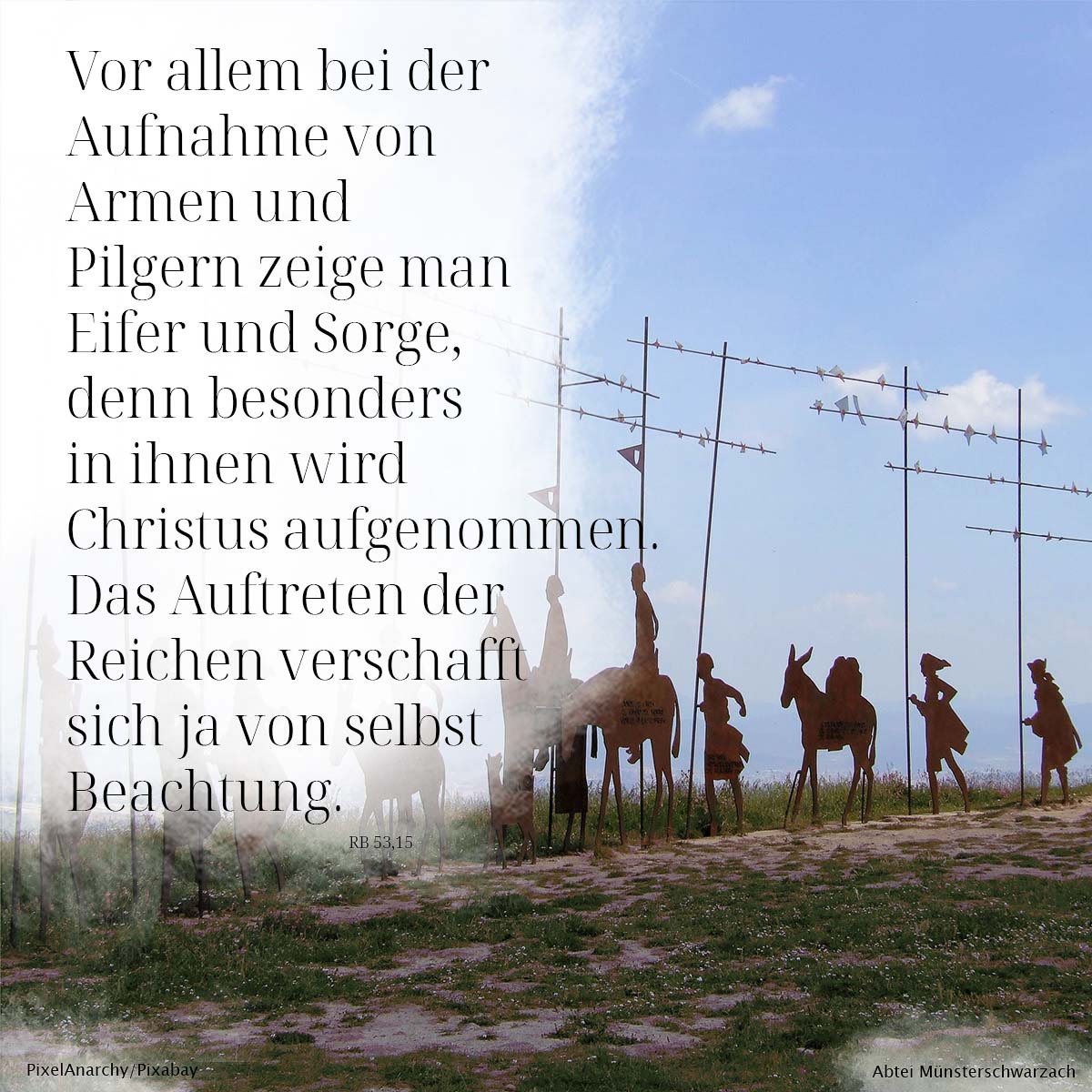 15. Vor allem bei der Aufnahme von Armen und Pilgern zeige man Eifer und Sorge, denn besonders in ihnen wird Christus aufgenommen. Das Auftreten der Reichen verschafft sich ja von selbst Beachtung.