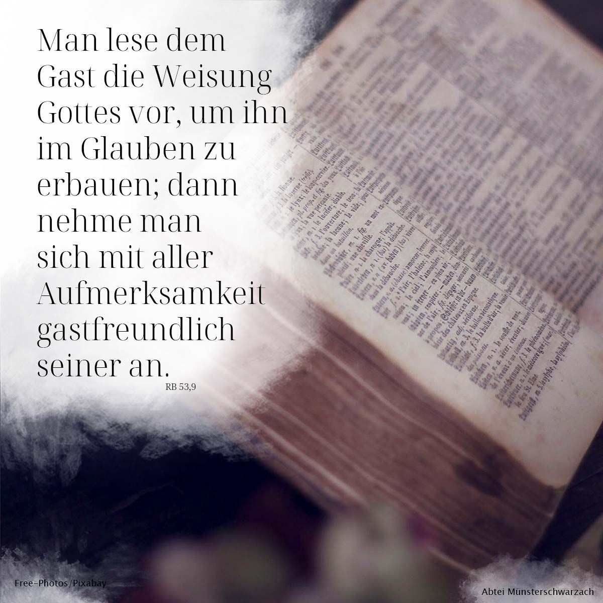 9. Man lese dem Gast die Weisung Gottes vor, um ihn im Glauben zu erbauen; dann nehme man sich mit aller Aufmerksamkeit gastfreundlich seiner an.