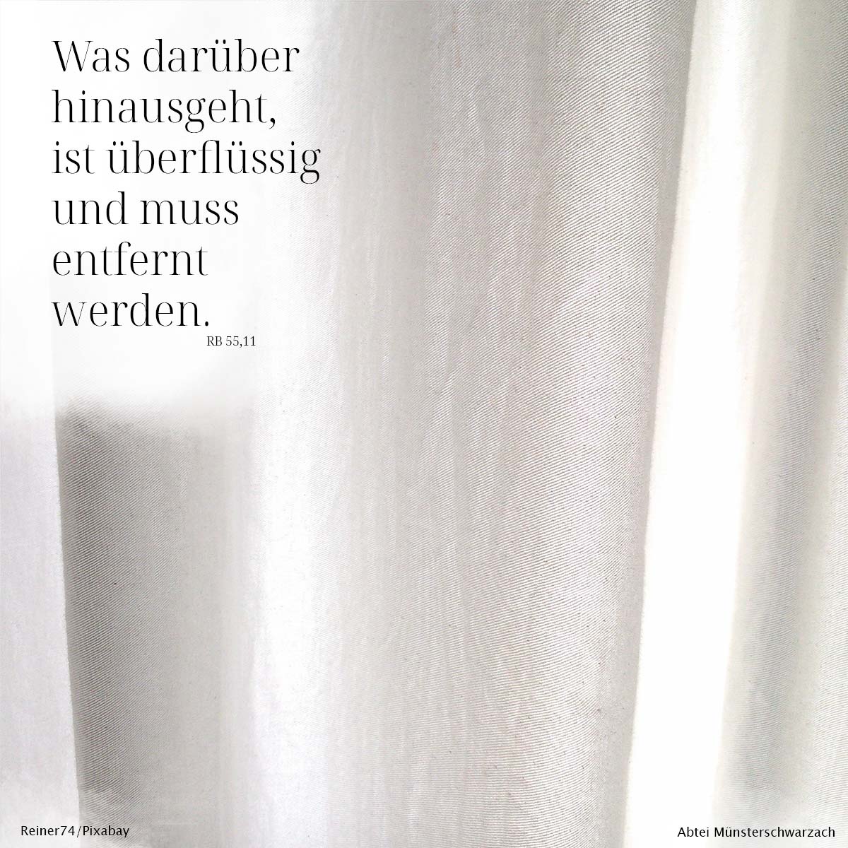 RB 55,11 Benediktsregel 55. Kapitel 11. Was darüber hinausgeht, ist überflüssig und muss entfernt werden.Benedikt macht seine Anliegen immer mit klaren Worten deutlich, so auch hier.Ein Überfluss ist nicht duldbar und muss entfernt werden.