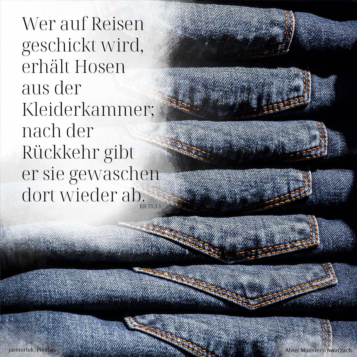 RB 55,12 Benediktsregel 55. Kapitel 12. Ebenso gibt man die Socke und alles Abgetragene ab, wenn man Neues bekommt.Benedikt schließt den Sinnabschnitt, indem er noch einmal zusammenfasst, dass nichts gehortet werden soll.