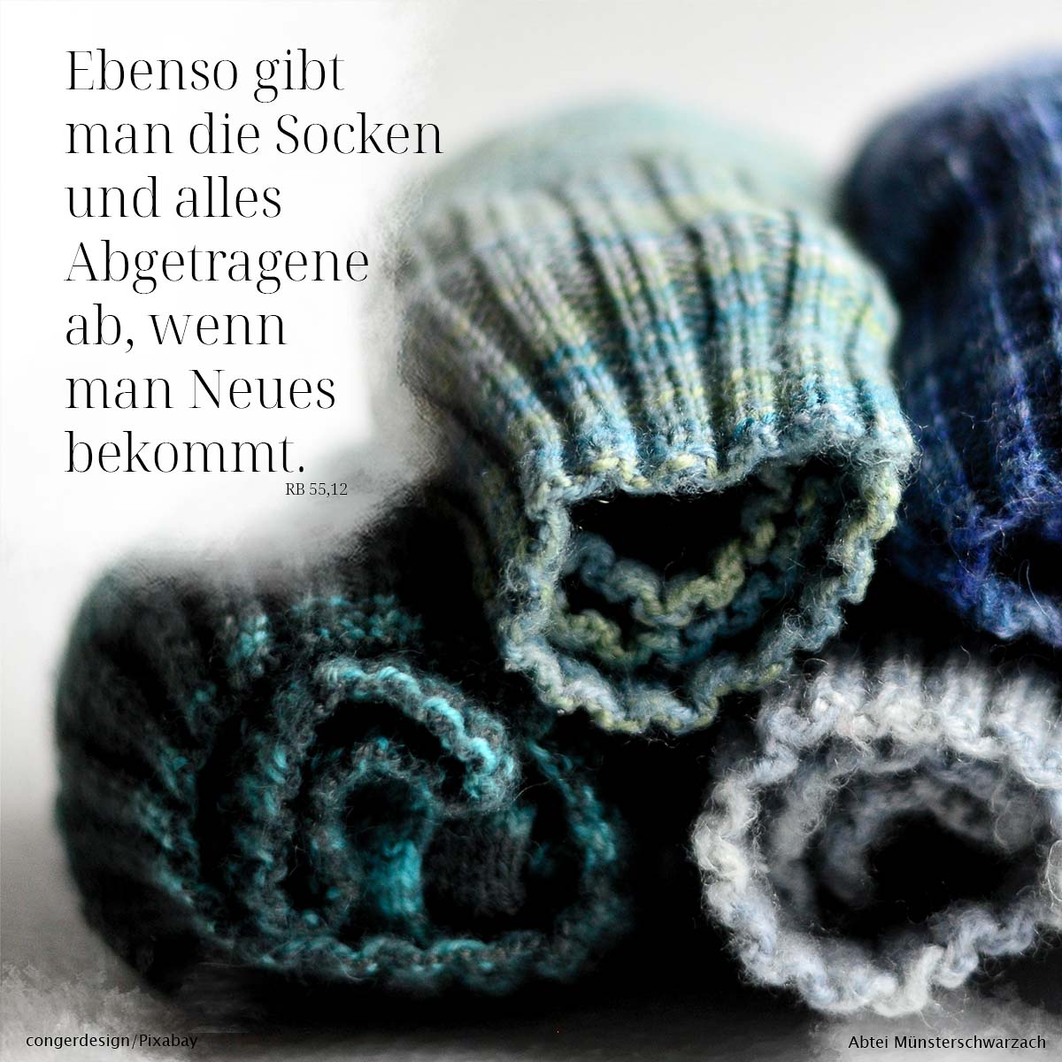 RB 55,13 Benediktsregel 55. Kapitel 13. Wer auf Reisen geschickt wird, erhält Hosen aus der Kleiderkammer; nach der Rückkehr gibt er sie gewaschen dort wieder ab.Auf Reisen sind andere Klamotten notwendig.Diese sind nachher wieder zurückzugeben.