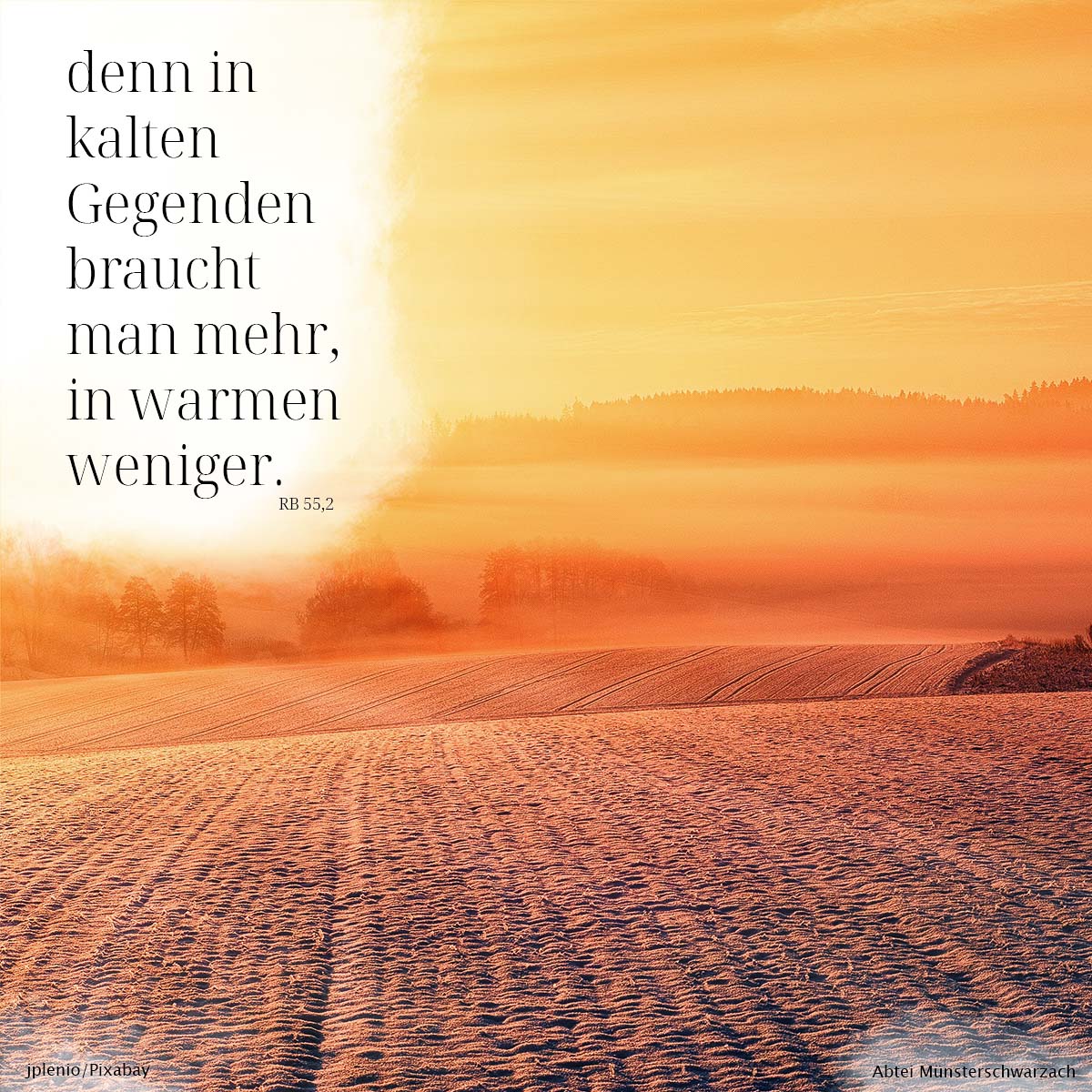RB 55,2 Benediktsregel 55. Kapitel 2. denn in kalten Gegenden braucht man mehr, in warmen weniger.Benedikt unterscheidet auch zwischen klimatischen Bedingungen in verschiedenen Gegenden.