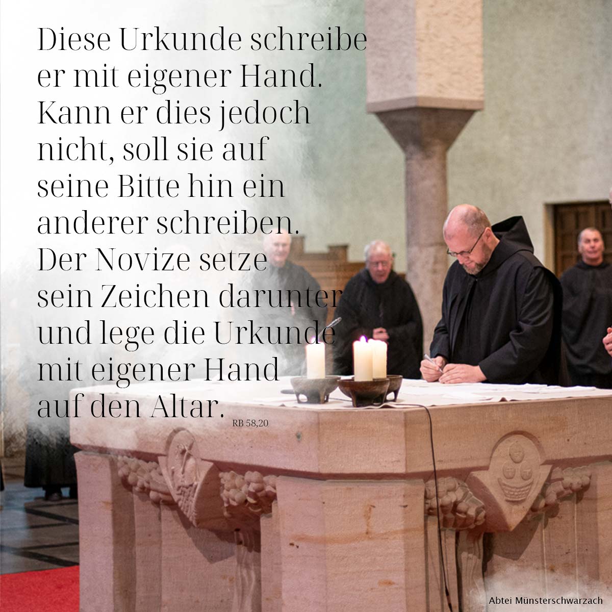20. Diese Urkunde schreibe er mit eigener Hand. Kann er dies jedoch nicht, soll sie auf seine Bitte hin ein anderer schreiben. Der Novize setze sein Zeichen darunter und lege die Urkunde mit eigener Hand auf den Altar.
